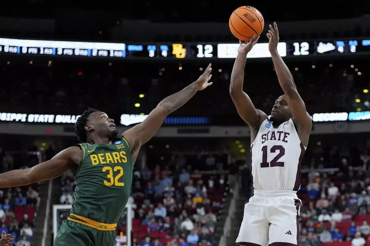 Mississippi State guard Josh Hubbard (12) shoots a three-point shot in front of Baylor guard Jalen Celestine (32) during the first half in the first round of the NCAA college basketball tournament, Friday, March 21, 2025, in Raleigh, N.C. (AP Photo/Stephanie Scarbrough)