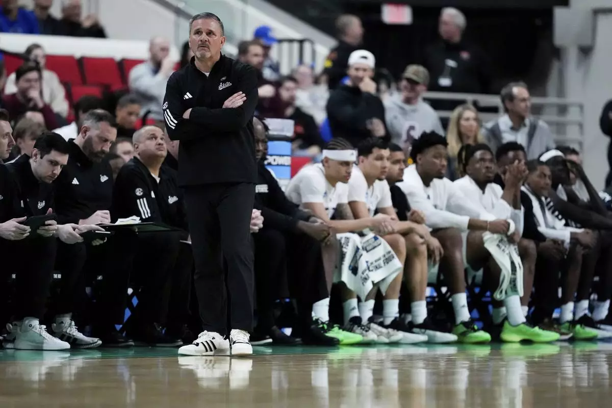 Mississippi State head coach Chris Jans watches during the first half in the first round of the NCAA college basketball tournament against Baylor, Friday, March 21, 2025, in Raleigh, N.C. (AP Photo/Stephanie Scarbrough)