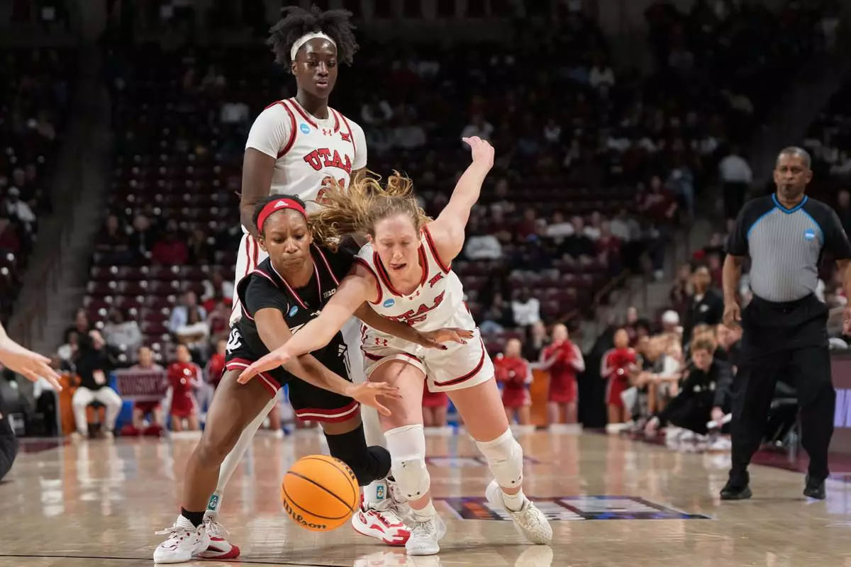 Utah guard Gianna Kneepken, right, fights for the ball with Indiana guard Chloe Moore-McNeil (22) during the second half in the first round of the NCAA college basketball tournament, Friday, March 21, 2025, in Columbia, S.C. (AP Photo/David Yeazell)