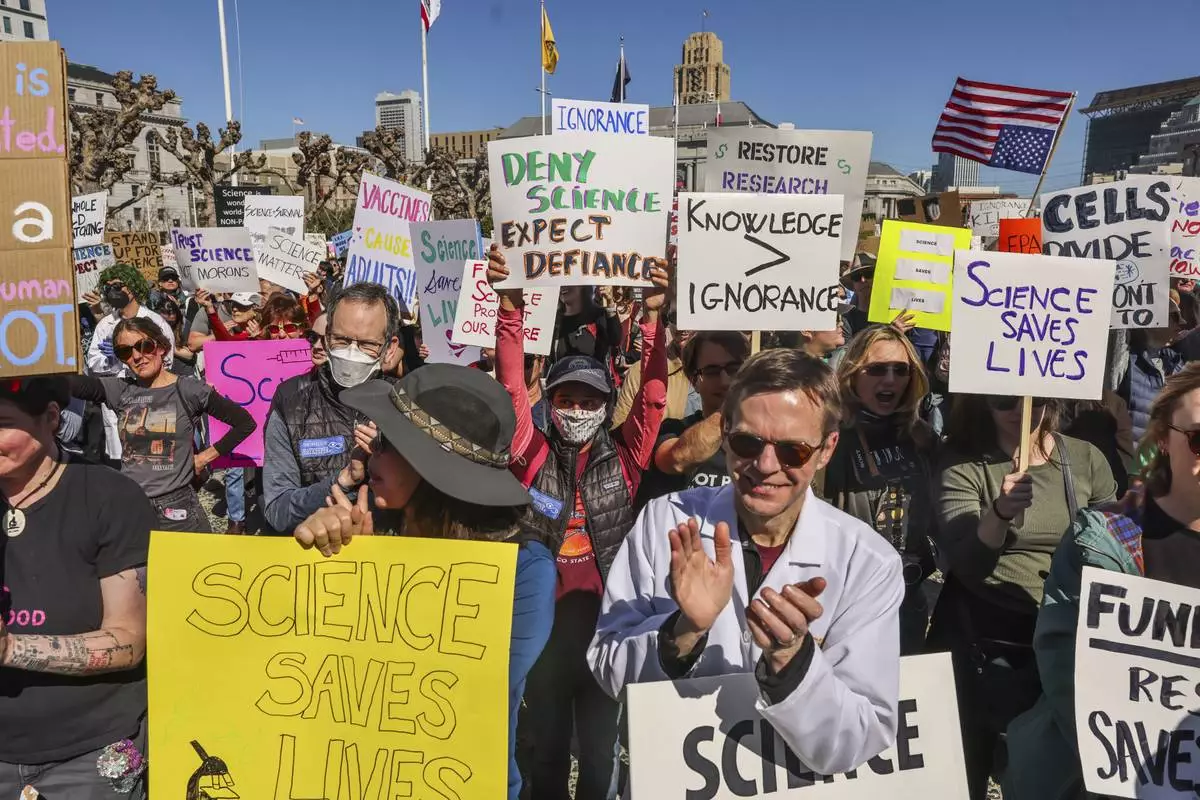 Scientists, advocates, and concerned citizens gather at the Civic Center Plaza during a Stand Up for Science rally to celebrate science and its critical role in public health, environmental stewardship, and education in San Francisco on Friday, March 7, 2025. (Gabrielle Lurie/San Francisco Chronicle via AP)