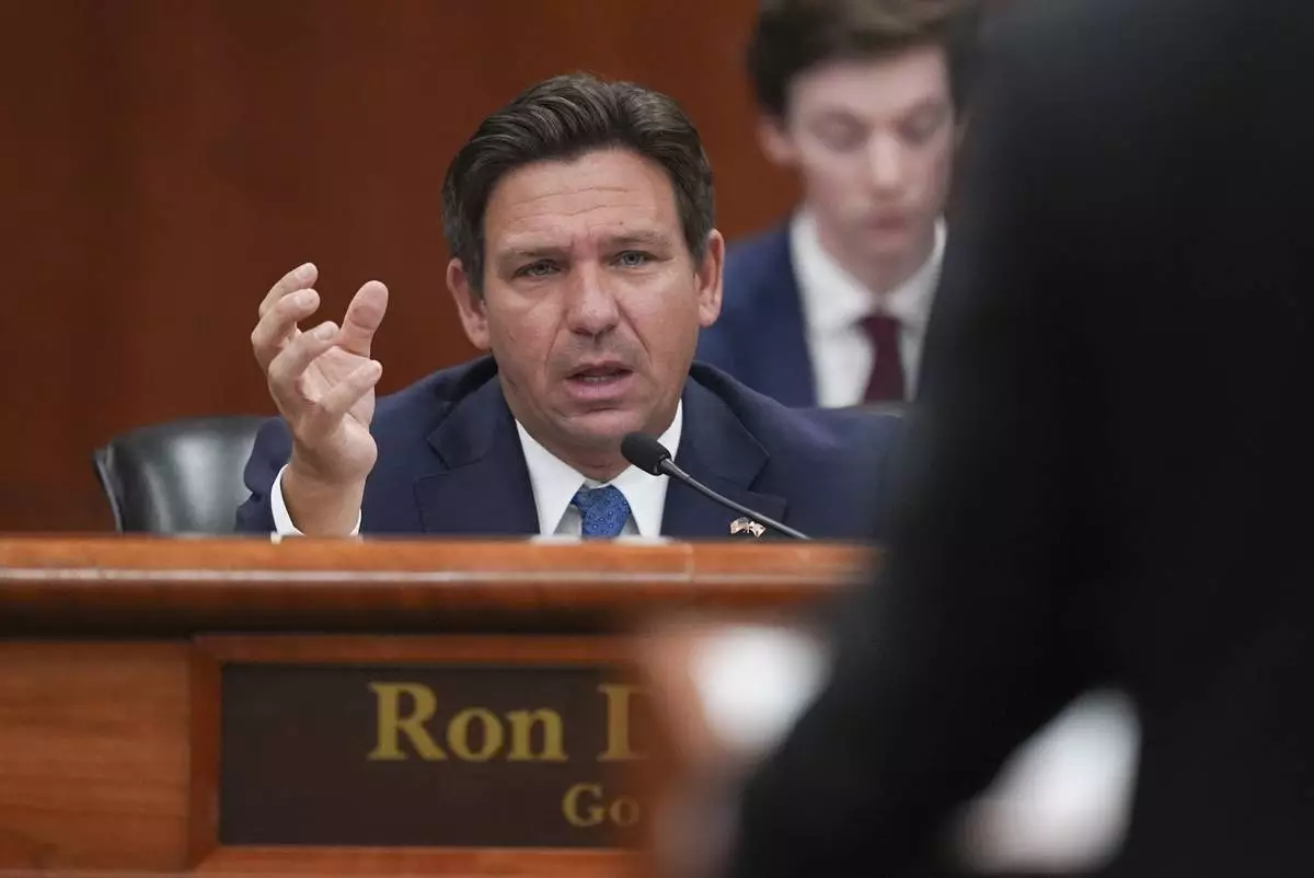 FILE - Gov. Ron DeSantis speaks during a meeting with the state cabinet, at the Florida capitol in Tallahassee, Fla., Wednesday, March 5, 2025. (AP Photo/Rebecca Blackwell, File)