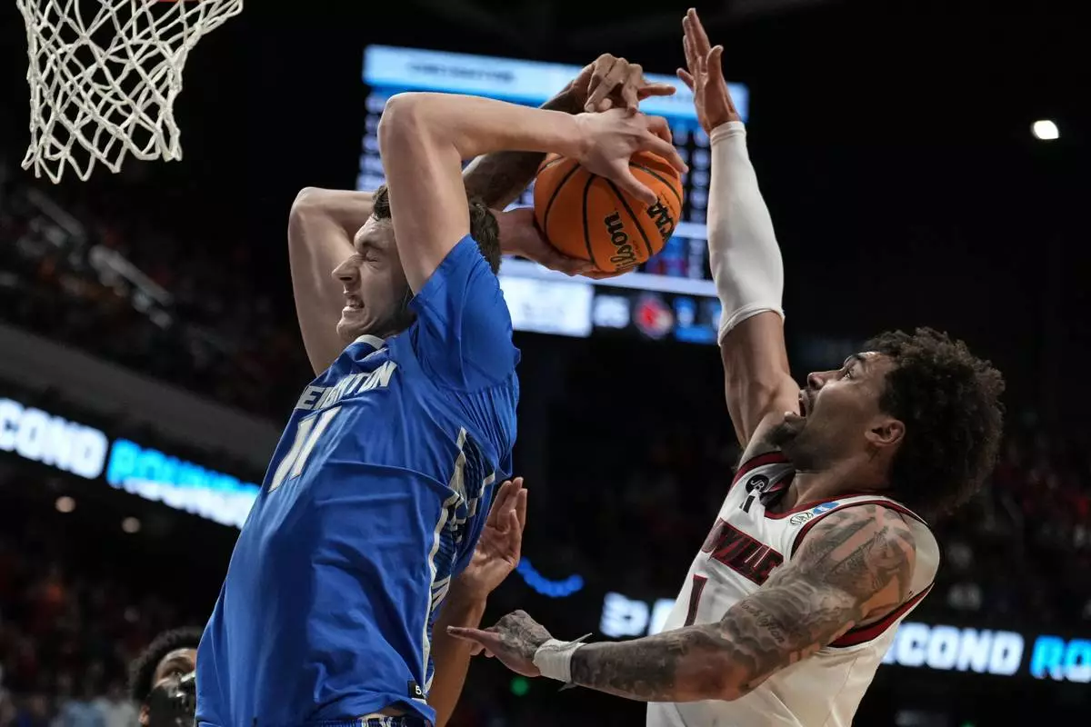 Creighton center Ryan Kalkbrenner (11) moves the basket against Louisville guard J'Vonne Hadley (1) during the first half in the first round of the NCAA college basketball tournament, Thursday, March 20, 2025, in Lexington, Ky. (AP Photo/Brynn Anderson)