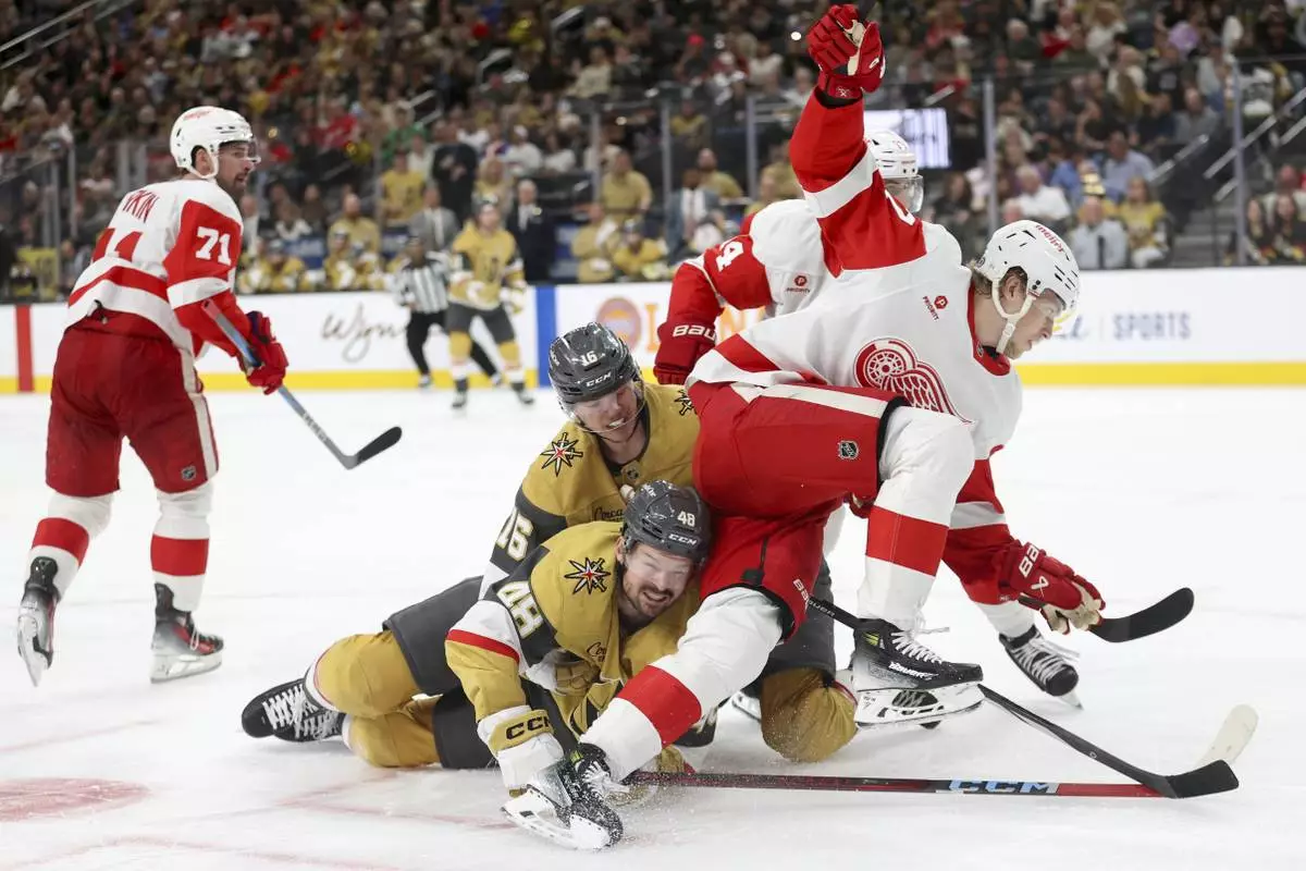 Vegas Golden Knights center Tomas Hertl (48) and Vegas Golden Knights left wing Pavel Dorofeyev (16) collide with Detroit Red Wings defenseman Simon Edvinsson (77) after a faceoff during the second period of an NHL hockey game Saturday, March 22, 2025, in Las Vegas. (AP Photo/Ian Maule)