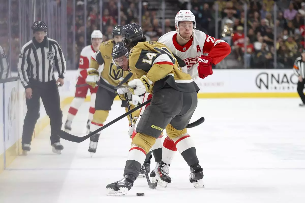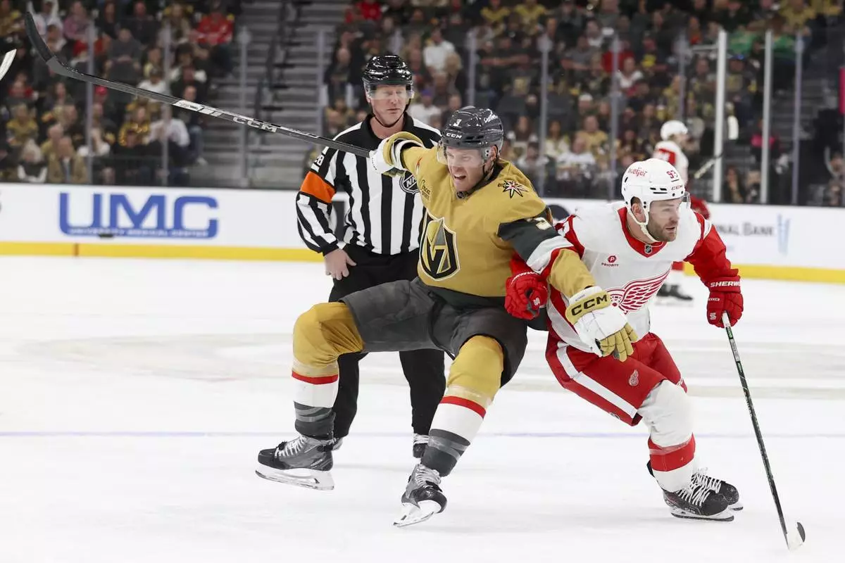 Detroit Red Wings left wing Lucas Raymond (23) collides with Vegas Golden Knights defenseman Nicolas Hague (14) during the first period of an NHL hockey game Saturday, March 22, 2025, in Las Vegas. (AP Photo/Ian Maule)
