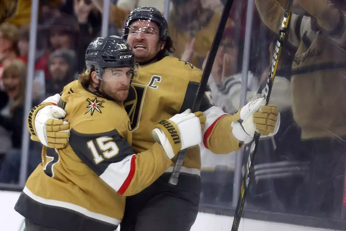 Vegas Golden Knights defenseman Noah Hanifin (15) and right wing Mark Stone (61) celebrate after Stone's goal during the second period of an NHL hockey game against the Detroit Red Wings, Saturday, March 22, 2025, in Las Vegas. (AP Photo/Ian Maule)