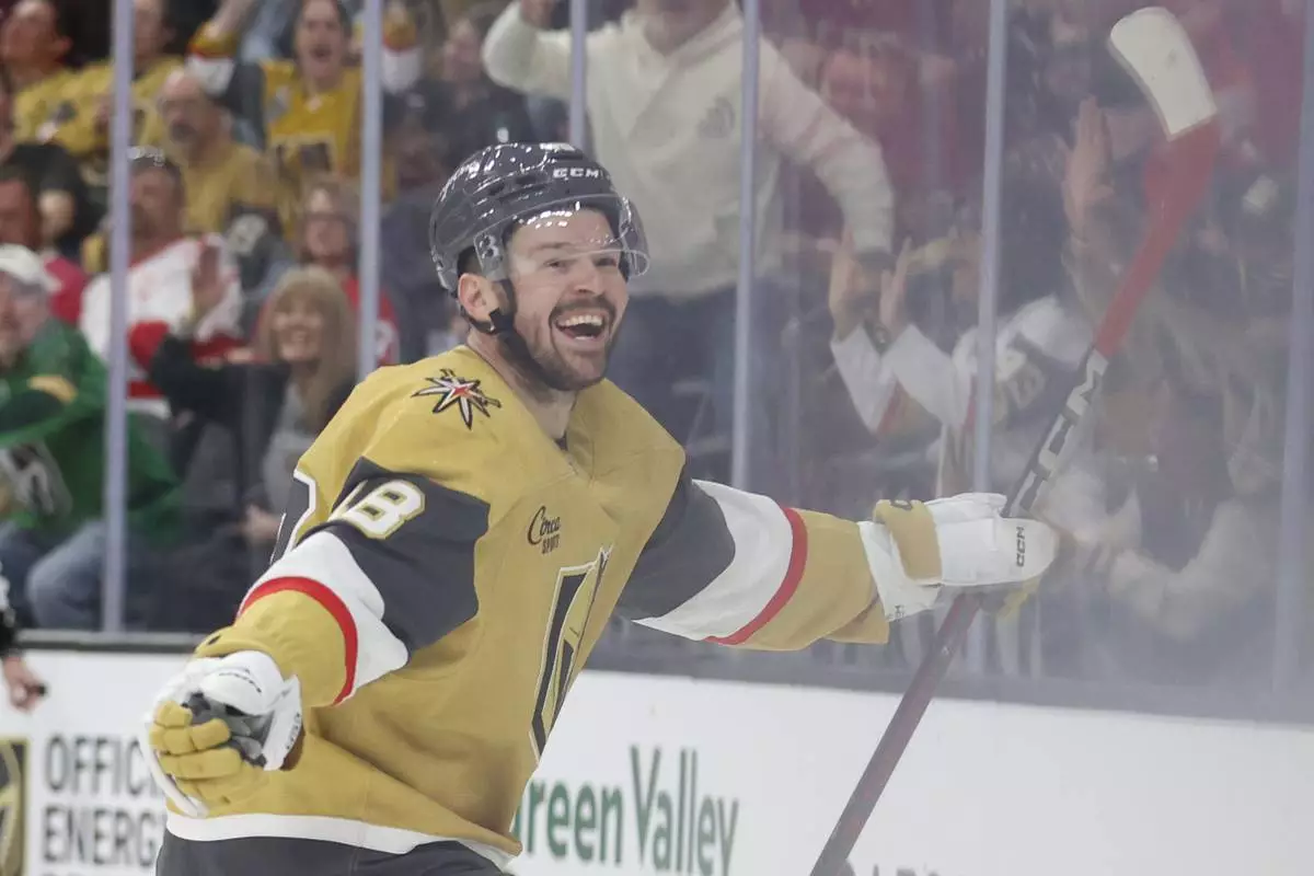 Vegas Golden Knights center Tomas Hertl (48) celebrates after scoring during the second period of an NHL hockey game against the Detroit Red Wings, Saturday, March 22, 2025, in Las Vegas. (AP Photo/Ian Maule)