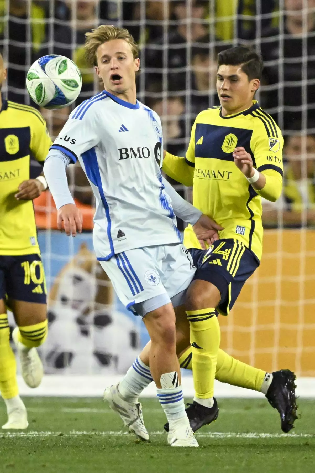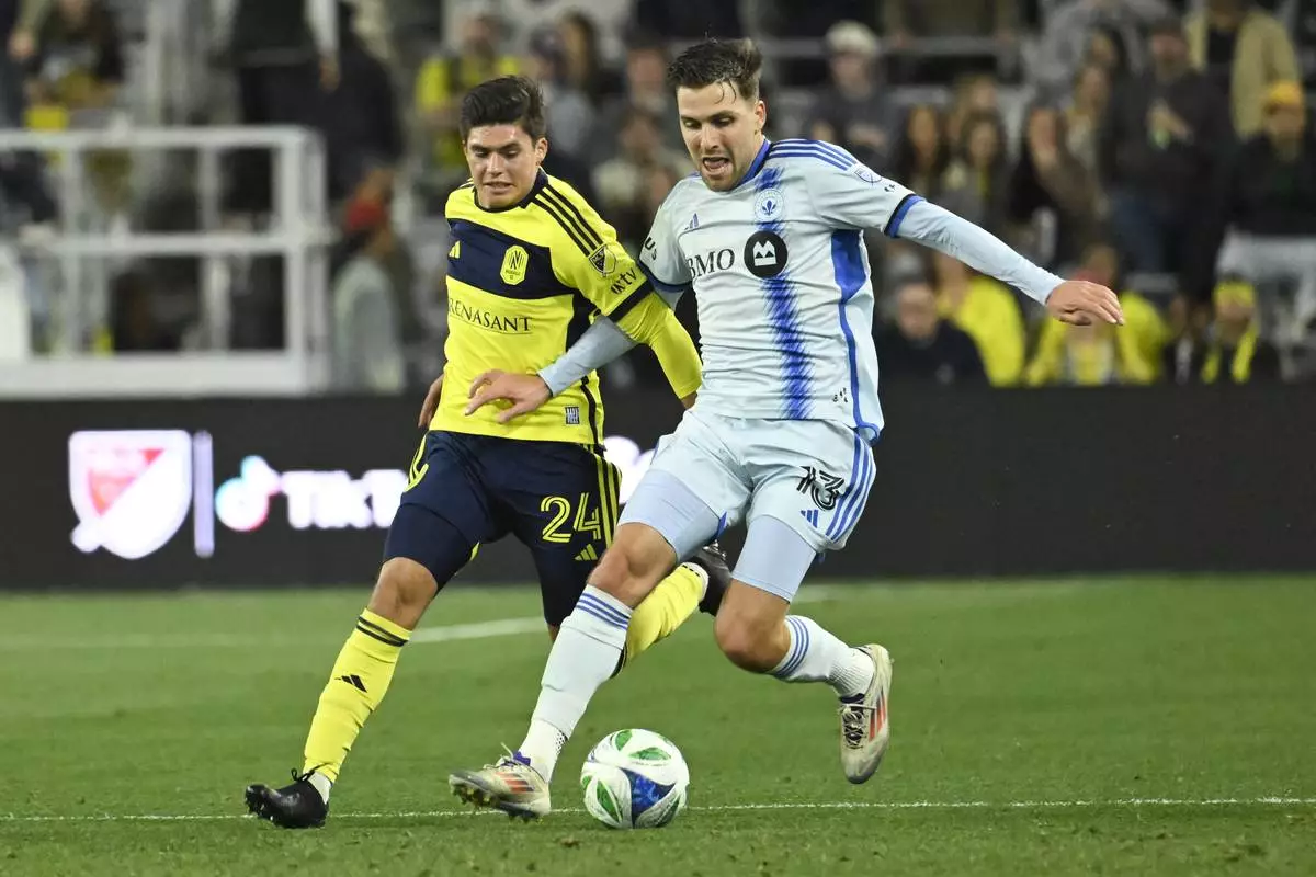CF Montréal midfielder Bryce Duke, left, and Nashville SC midfielder Jonathan Pérez (24) vie for the ball during the first half of an MLS soccer match Saturday, March 22, 2025, in Nashville, Tenn. (AP Photo/John Amis)