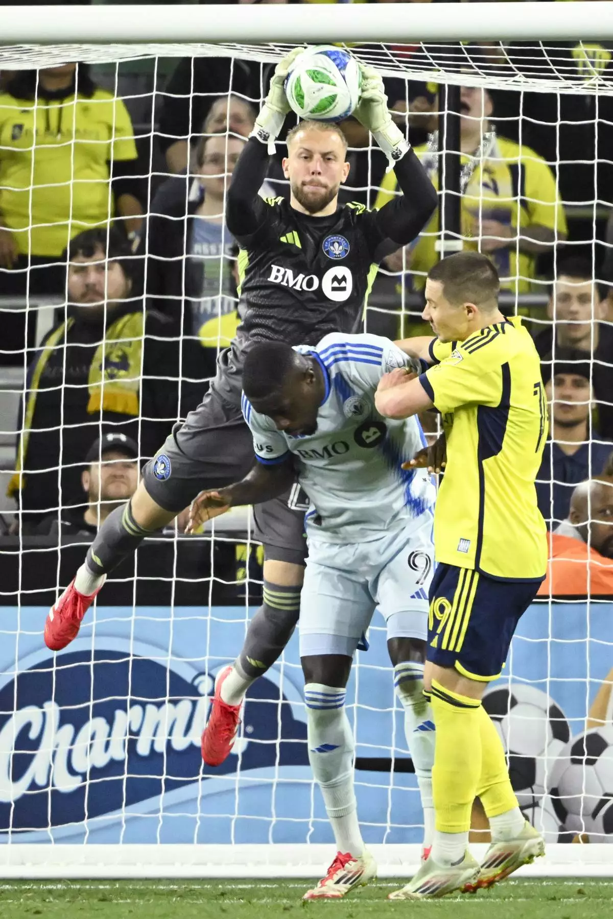 CF Montréal goalkeeper Jonathan Sirois, top, makes a save in front of CF Montréal forward Prince Osei Owusu (9) and Nashville SC midfielder Alex Muyl (19) during the first half of an MLS soccer match Saturday, March 22, 2025, in Nashville, Tenn. (AP Photo/John Amis)