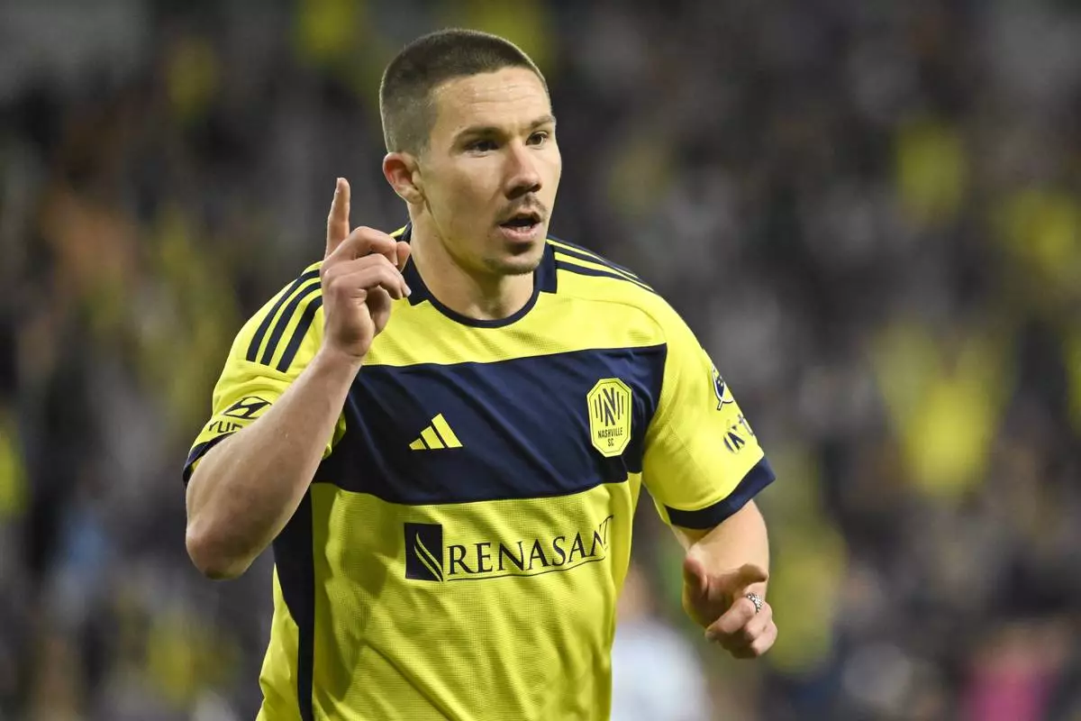 Nashville SC midfielder Alex Muyl reacts after scoring against CF Montréal against during the second half of an MLS soccer match Saturday, March 22, 2025, in Nashville, Tenn. (AP Photo/John Amis)