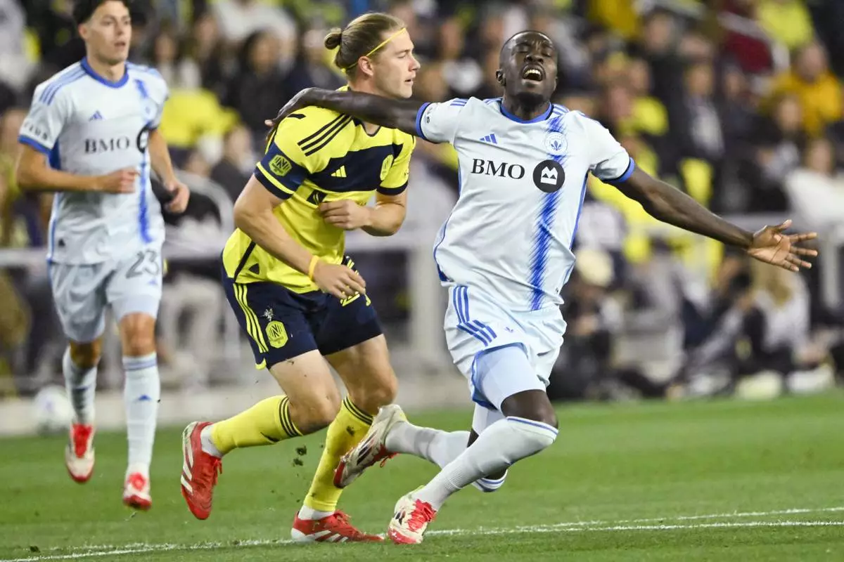 CF Montréal forward Prince Osei Owusu (9) reacts as Nashville SC defender Walker Zimmerman, left, defends him during the first half of an MLS soccer match Saturday, March 22, 2025, in Nashville, Tenn. (AP Photo/John Amis)