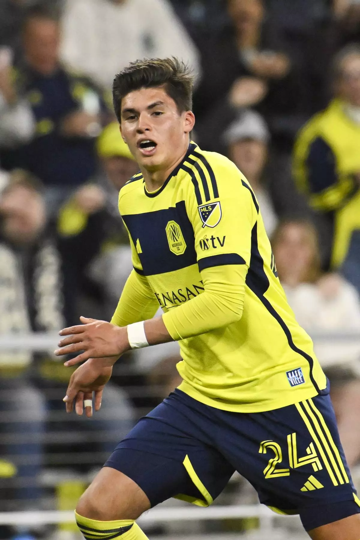 Nashville SC midfielder Jonathan Pérez (24) watches his shot go in against CF Montréal during the second half of an MLS soccer match Saturday, March 22, 2025, in Nashville, Tenn. (AP Photo/John Amis)