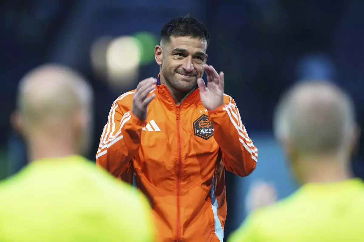 Houston Dynamo midfielder Nicolás Lodeiro acknowledges the crowd as he is honored by the Seattle Sounders for his contribution to the club before an MLS soccer match Saturday, March 22, 2025, in Seattle. (AP Photo/Lindsey Wasson)