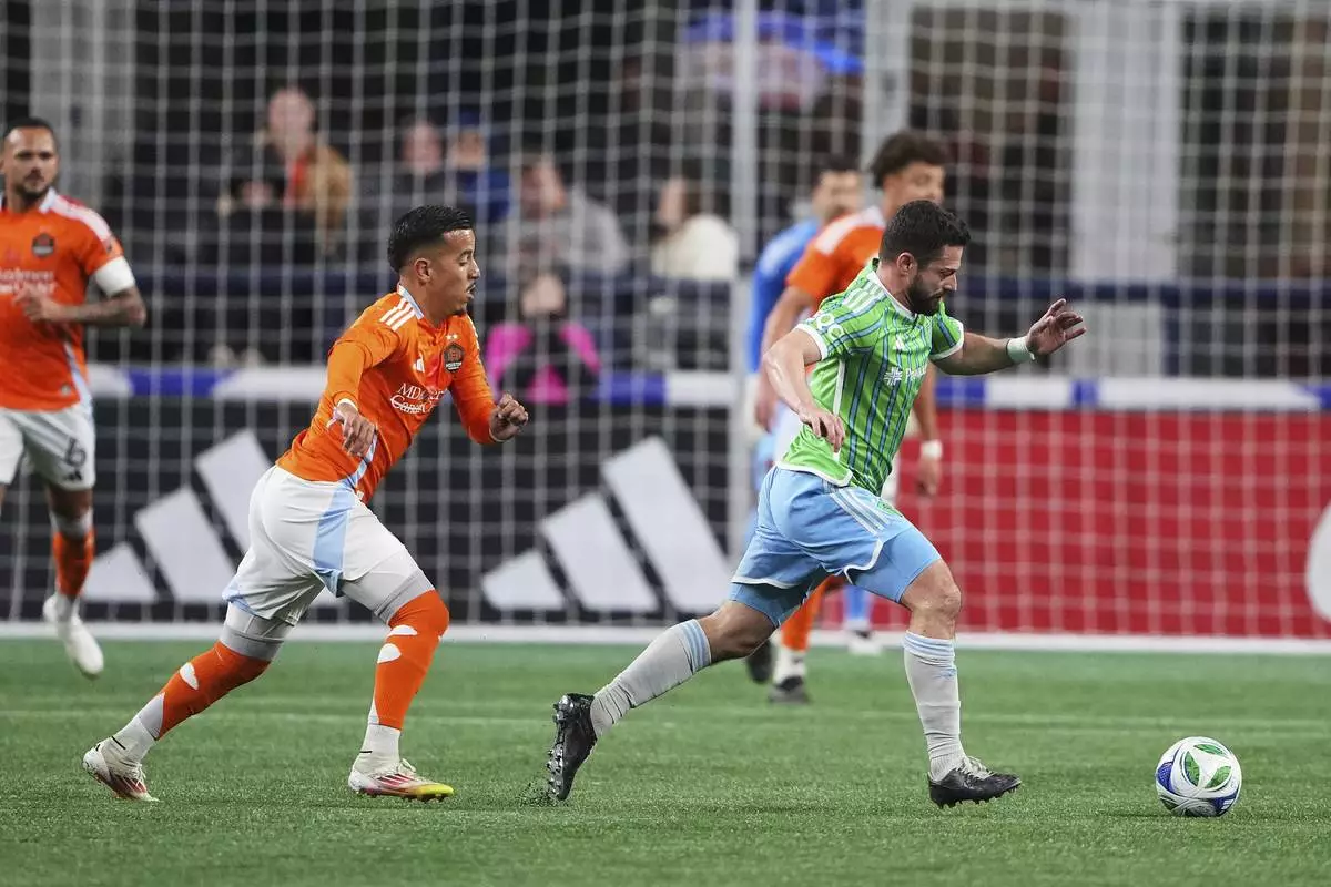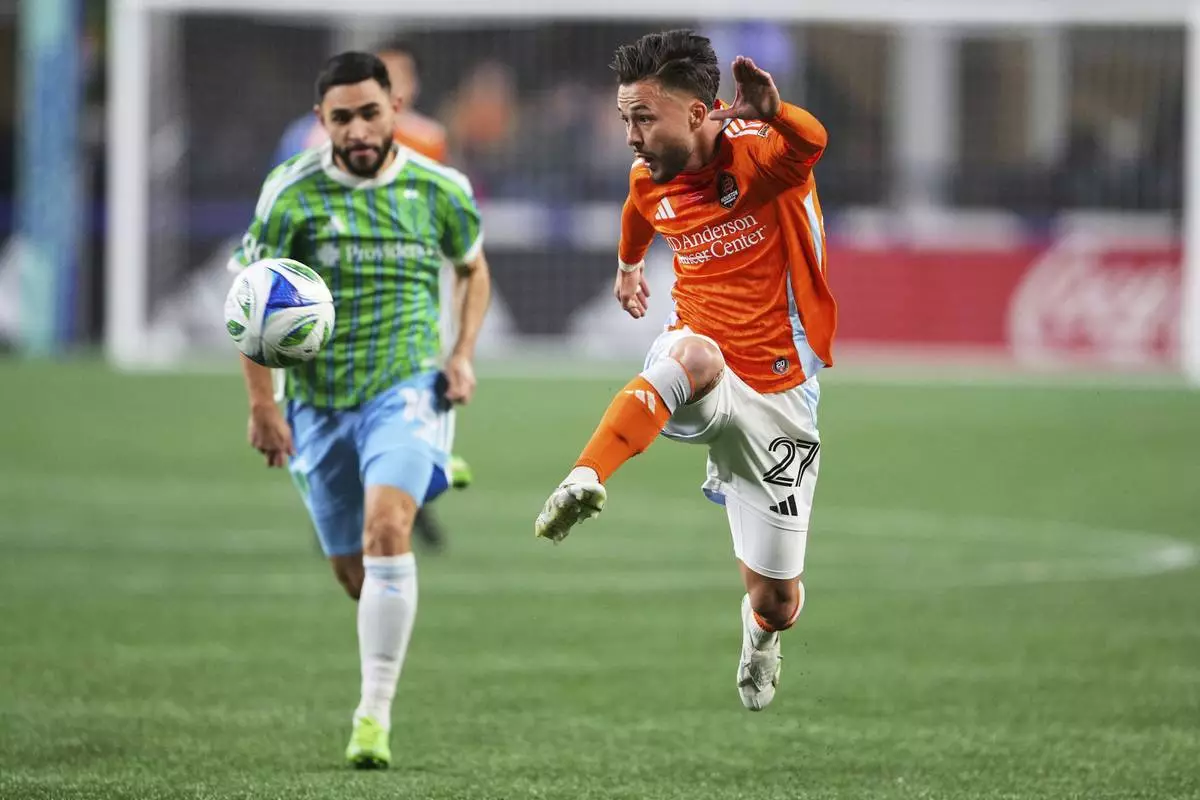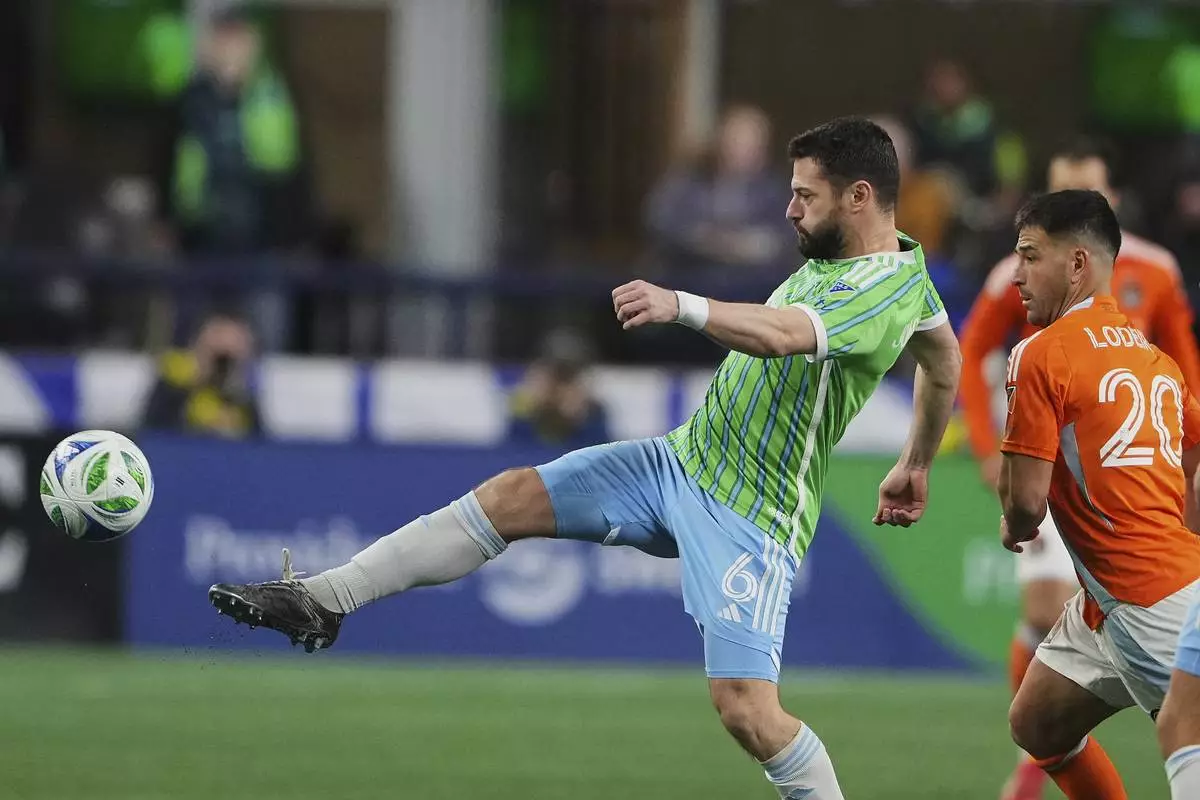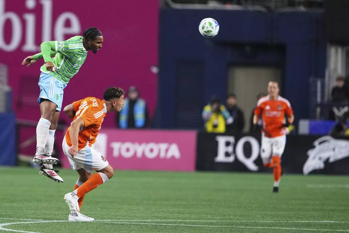 Houston Dynamo midfielder Sebastian Kowalczyk leaps for the ball against Seattle Sounders midfielder Alex Roldan, left, during the first half of an MLS soccer match Saturday, March 22, 2025, in Seattle. (AP Photo/Lindsey Wasson)