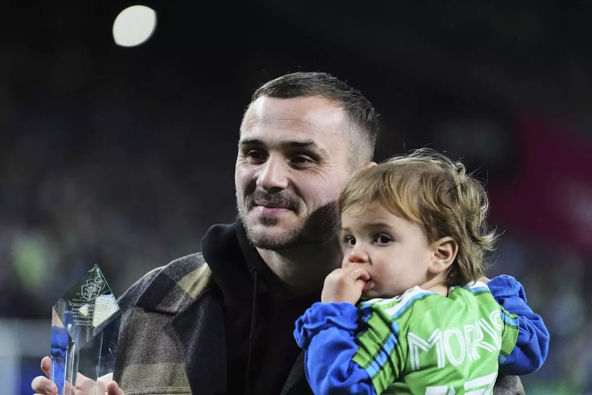 Seattle Sounders forward Jordan Morris holds his son Theo as he is honored in a halftime ceremony for becoming the club's all-time leading scorer, during an MLS soccer match against the Houston Dynamo Saturday, March 22, 2025, in Seattle. (AP Photo/Lindsey Wasson)