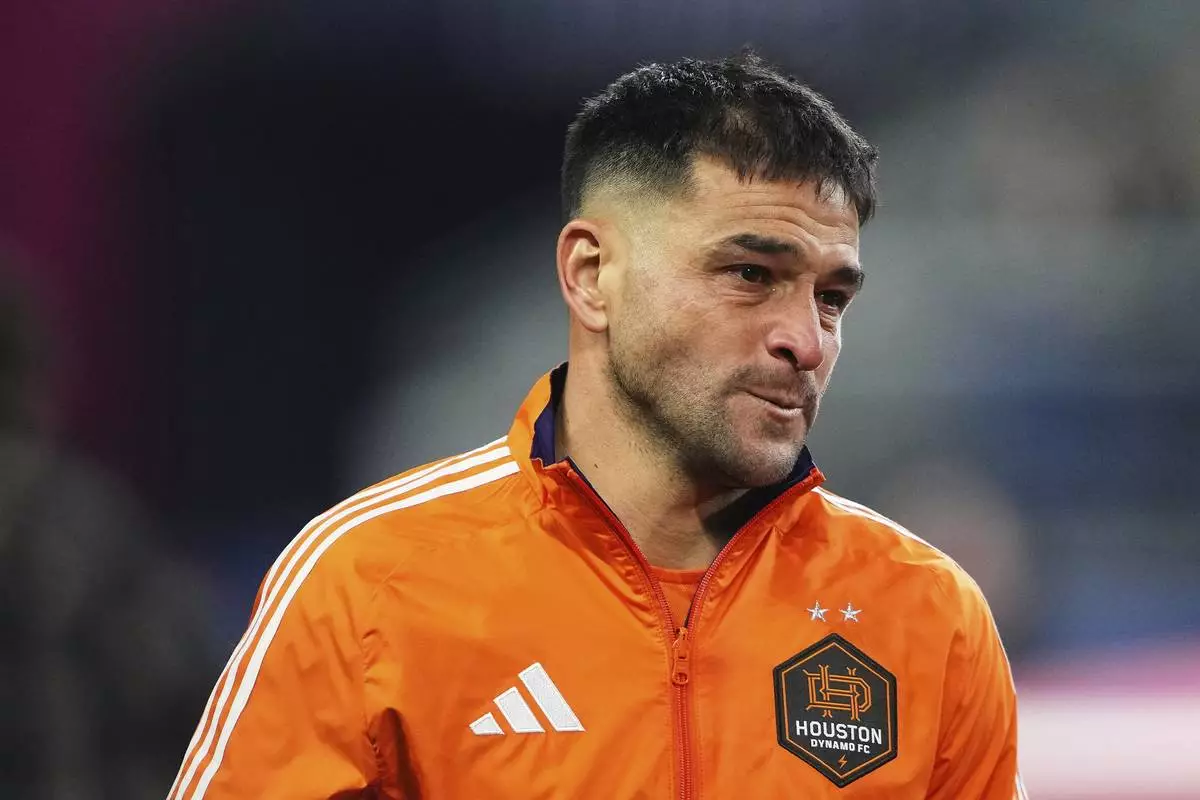 Houston Dynamo midfielder Nicolás Lodeiro becomes emotional after the national anthem before facing his former team, the Seattle Sounders, in an MLS soccer match Saturday, March 22, 2025, in Seattle. (AP Photo/Lindsey Wasson)
