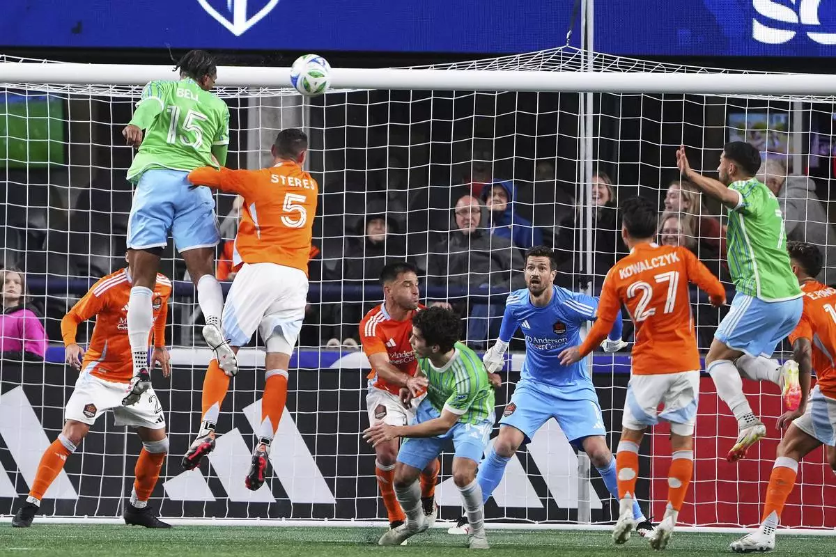 Houston Dynamo goalkeeper Jimmy Maurer (1) looks on as Seattle Sounders defender Jon Bell (15) tries to head the ball in from a corner kick during the first half of an MLS soccer match Saturday, March 22, 2025, in Seattle. (AP Photo/Lindsey Wasson)