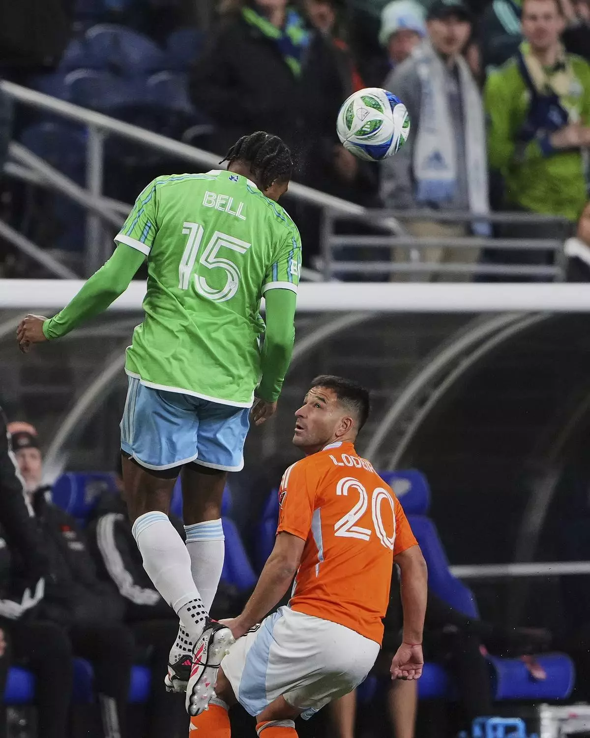 Seattle Sounders defender Jon Bell (15) heads the ball as Houston Dynamo midfielder Nicolás Lodeiro (20) looks on during the first half of an MLS soccer match Saturday, March 22, 2025, in Seattle. (AP Photo/Lindsey Wasson)