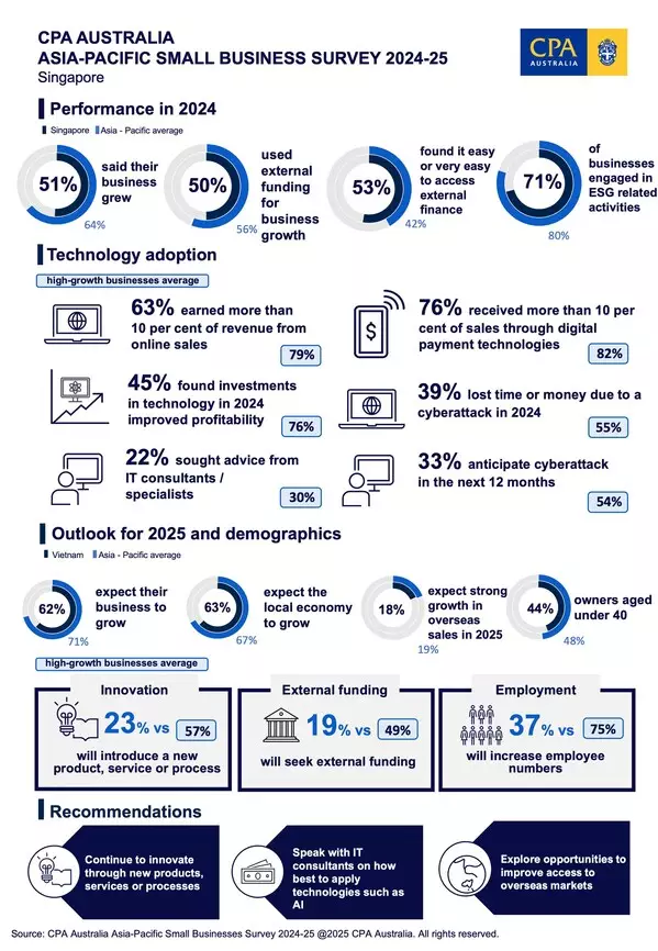 SINGAPORE, March 24, 2025 /PRNewswire/ -- Business sentiment among small businesses in Singapore last year surged to its highest level since 2019, and this positive trend is expected to continue into 2025, according to the latest survey by global professional accounting body CPA Australia.
