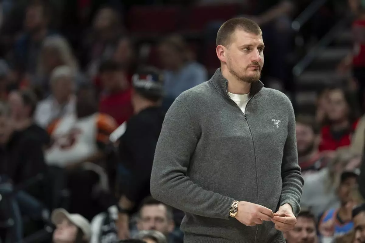 Denver Nuggets center Nikola Jokic walks on the sideline during the first half of an NBA basketball game against the Portland Trail Blazers, Friday, March 21, 2025, in Portland, Ore. (AP Photo/Jenny Kane)