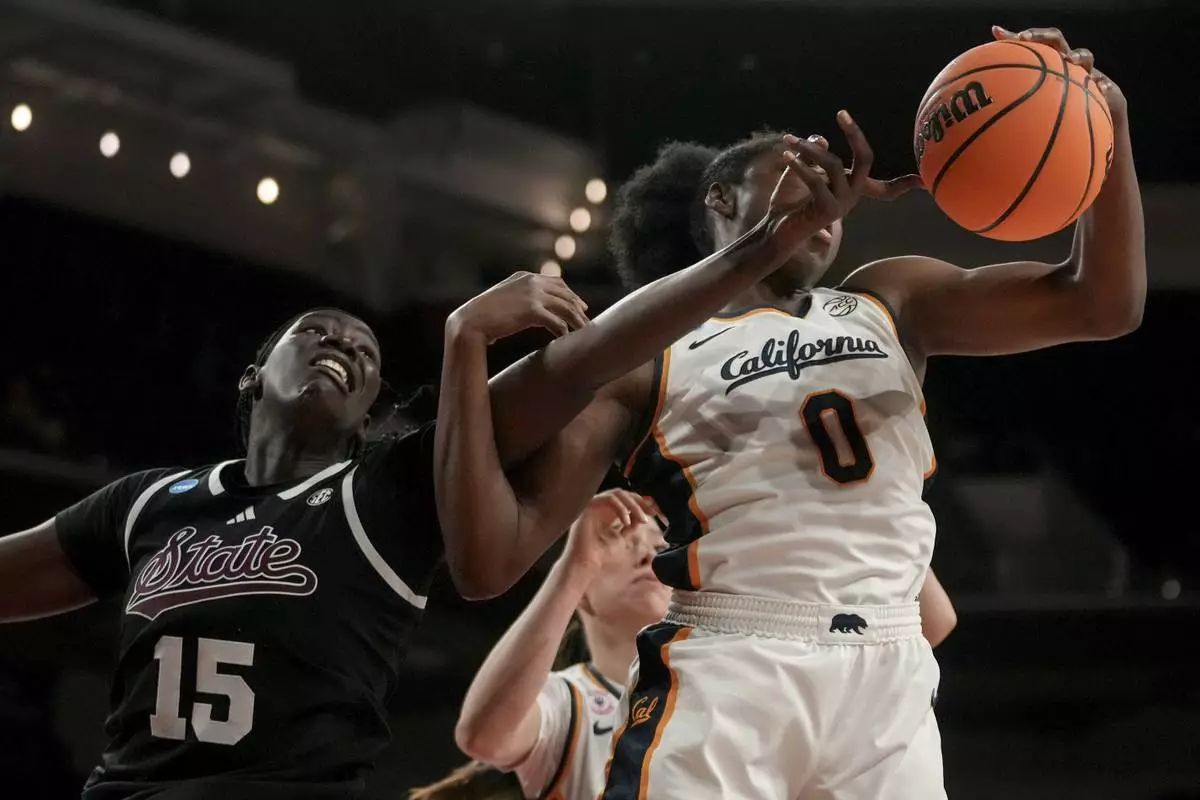 Mississippi State center Madina Okot (15) and California forward Ugonne Onyiah (0) fight for a rebound during the first half in the first round of the NCAA college basketball tournament Saturday, March 22, 2025, in Los Angeles. (AP Photo/Eric Thayer)