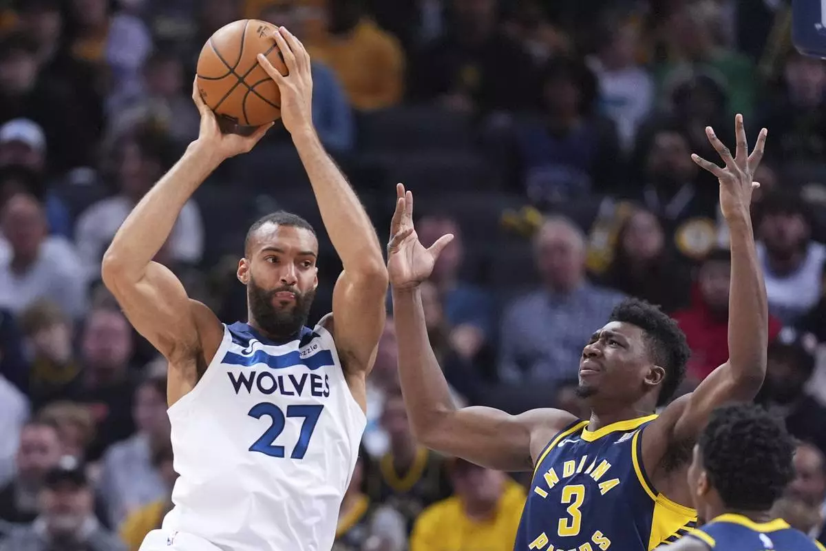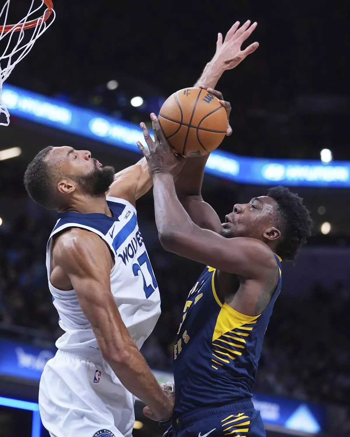 Minnesota Timberwolves center Rudy Gobert (27) grabs a rebound over Indiana Pacers center Thomas Bryant (3) during the first half of an NBA basketball game in Indianapolis, Monday, March 24, 2025. (AP Photo/Michael Conroy)