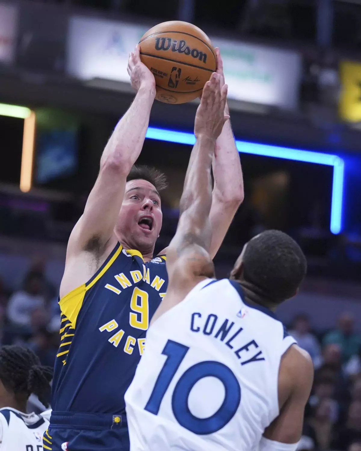 Indiana Pacers guard T.J. McConnell (9) shoots over Minnesota Timberwolves guard Mike Conley (10) during the first half of an NBA basketball game in Indianapolis, Monday, March 24, 2025. (AP Photo/Michael Conroy)