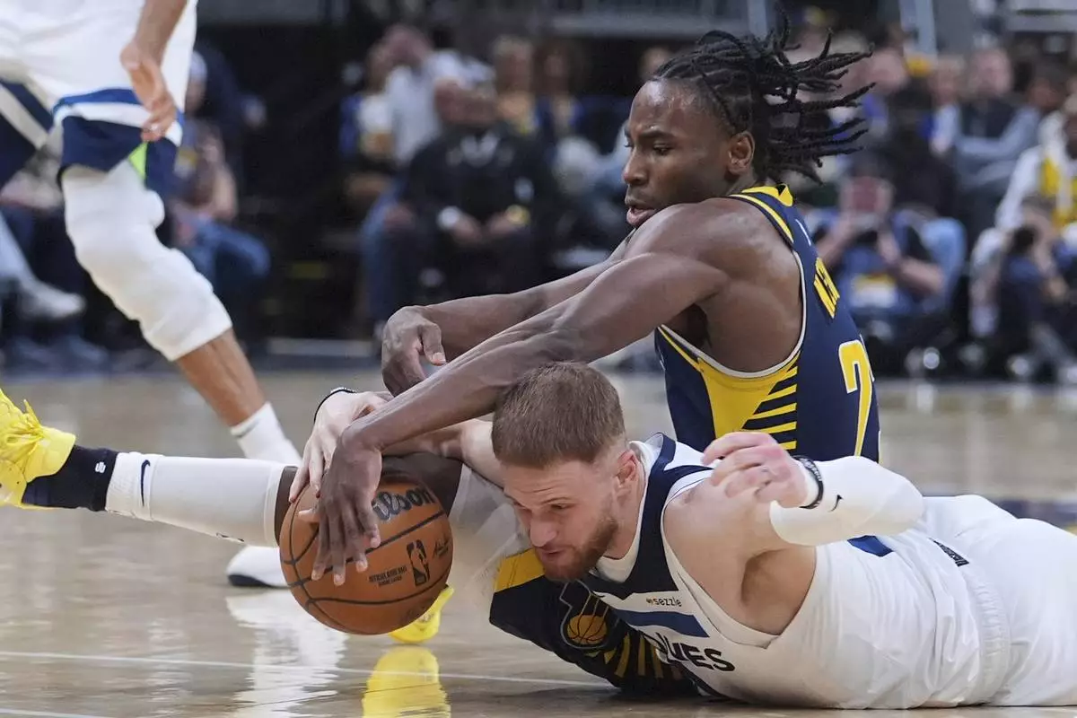 Indiana Pacers forward Aaron Nesmith (23) and Minnesota Timberwolves guard Donte DiVincenzo (0) go to the floor for a loos ball during the second half of an NBA basketball game in Indianapolis, Monday, March 24, 2025. (AP Photo/Michael Conroy)