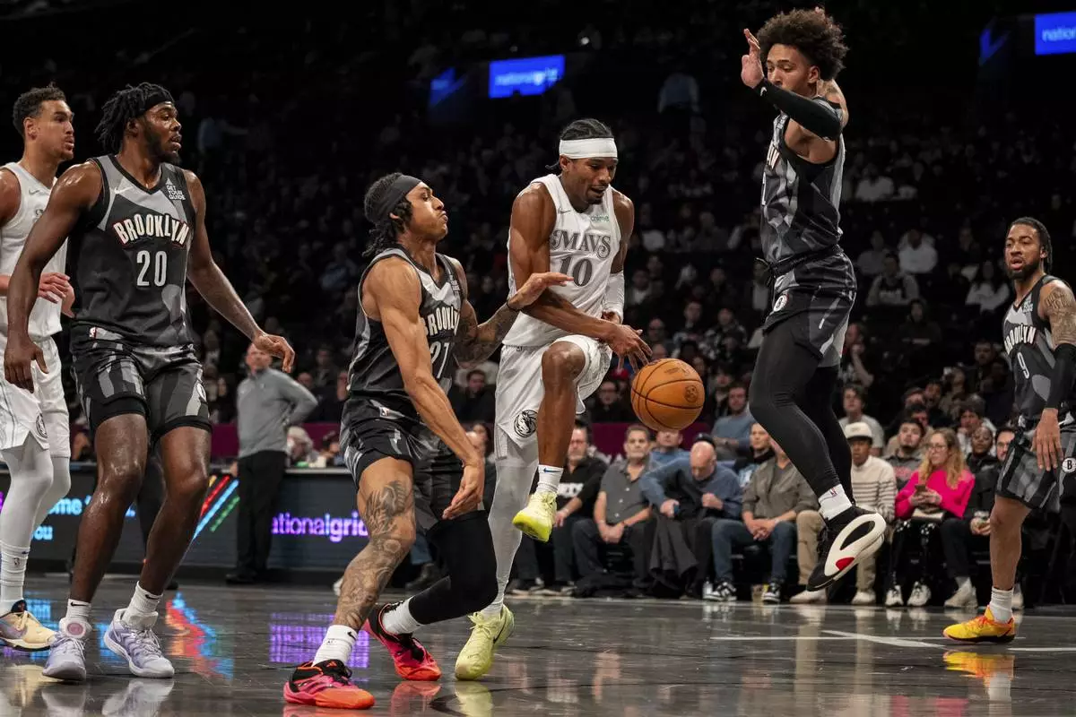 Dallas Mavericks guard Brandon Williams (10) loses control of the ball before regaining it and scoring a two-pointer during the first half of an NBA basketball game against the Brooklyn Nets, Monday, March 24, 2025, in New York. (AP Photo/Angelina Katsanis)