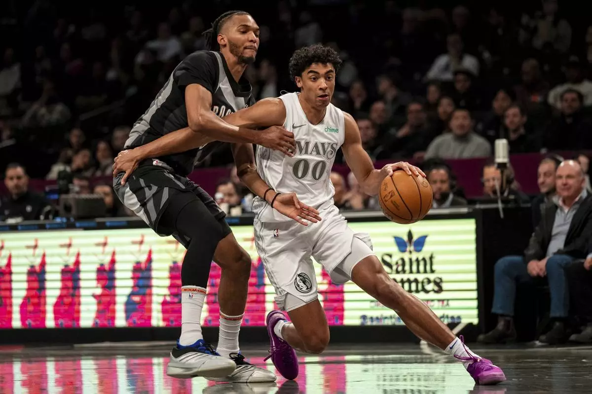 Dallas Mavericks guard Max Christie (00) pushes toward the basket during the first half of an NBA basketball game against the Brooklyn Nets, Monday, March 24, 2025, in New York. (AP Photo/Angelina Katsanis)