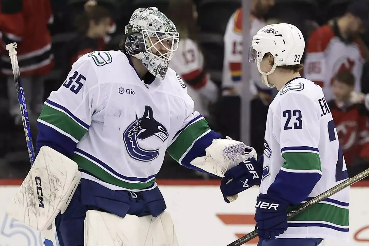 Vancouver Canucks goaltender Thatcher Demko congratulates Jonathan Lekkerimaki (23) who scored the game winning goal during a shootout of an NHL hockey game against the New Jersey Devils Monday, March 24, 2025, in Newark, N.J. (AP Photo/Adam Hunger)