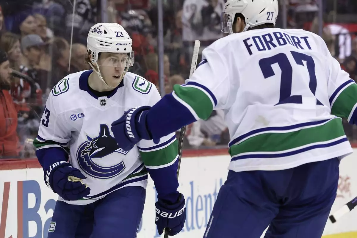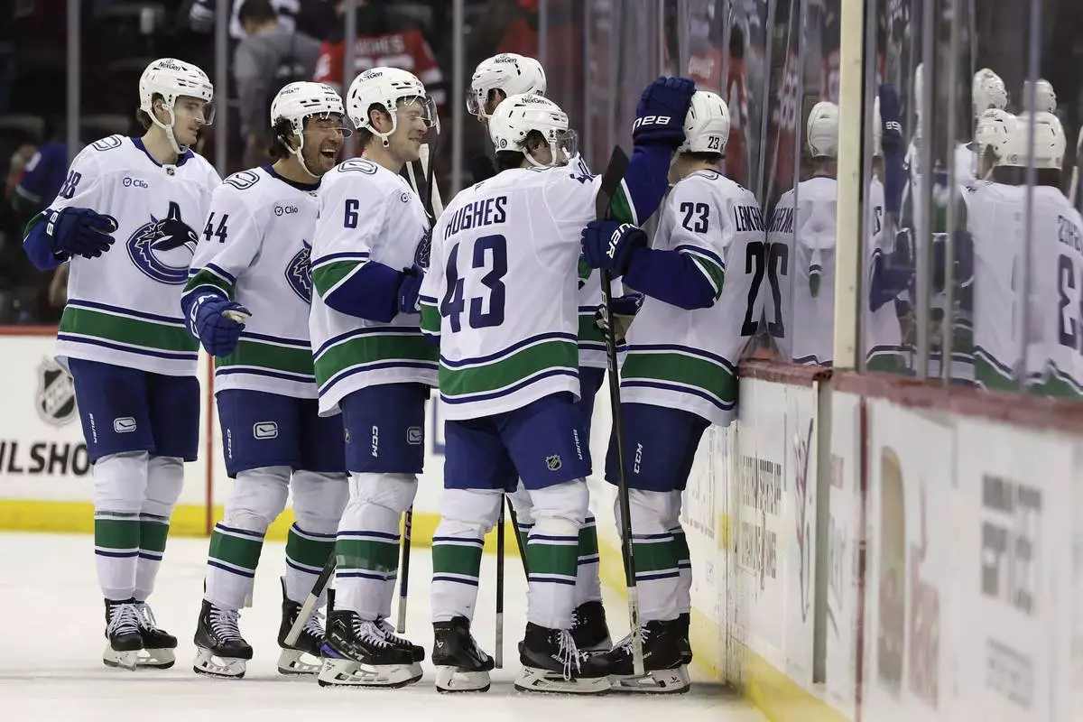 Vancouver Canucks right wing Jonathan Lekkerimaki (23) is congratulated after scoring a goal by Derek Forbort during the third period of an NHL hockey game against the New Jersey Devils Monday, March 24, 2025, in Newark, N.J. (AP Photo/Adam Hunger)
