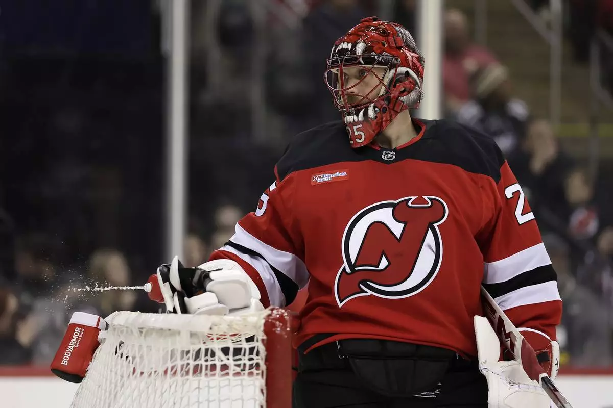 New Jersey Devils goaltender Jacob Markstrom reacts after giving up a goal during the first period of an NHL hockey game against the Vancouver Canucks Monday, March 24, 2025, in Newark, N.J. (AP Photo/Adam Hunger)