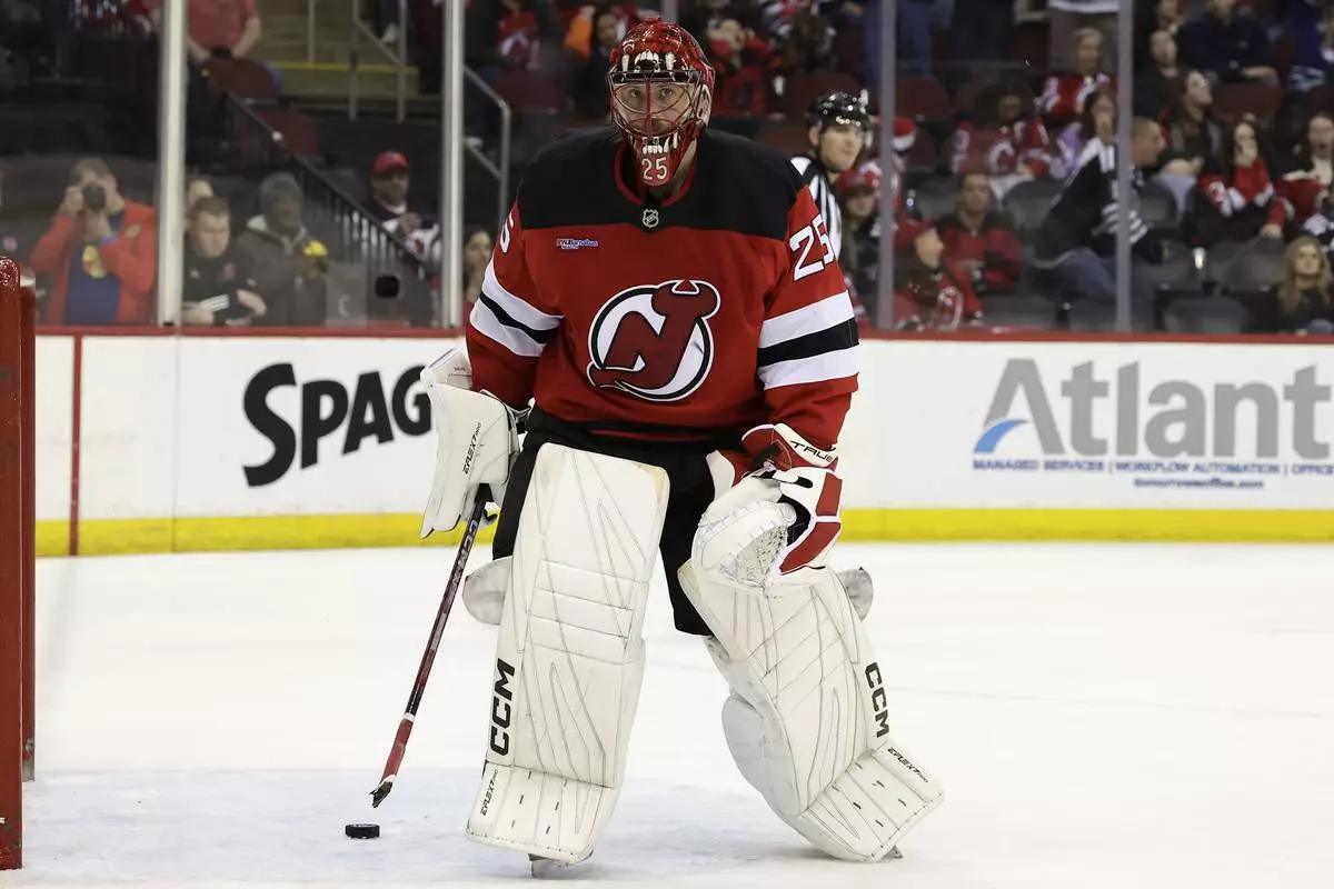 New Jersey Devils goaltender Jacob Markstrom skates off with a broken stick after giving up a goal during a shootout of an NHL hockey game against the Vancouver Canucks, Monday, March 24, 2025, in Newark, N.J. (AP Photo/Adam Hunger)