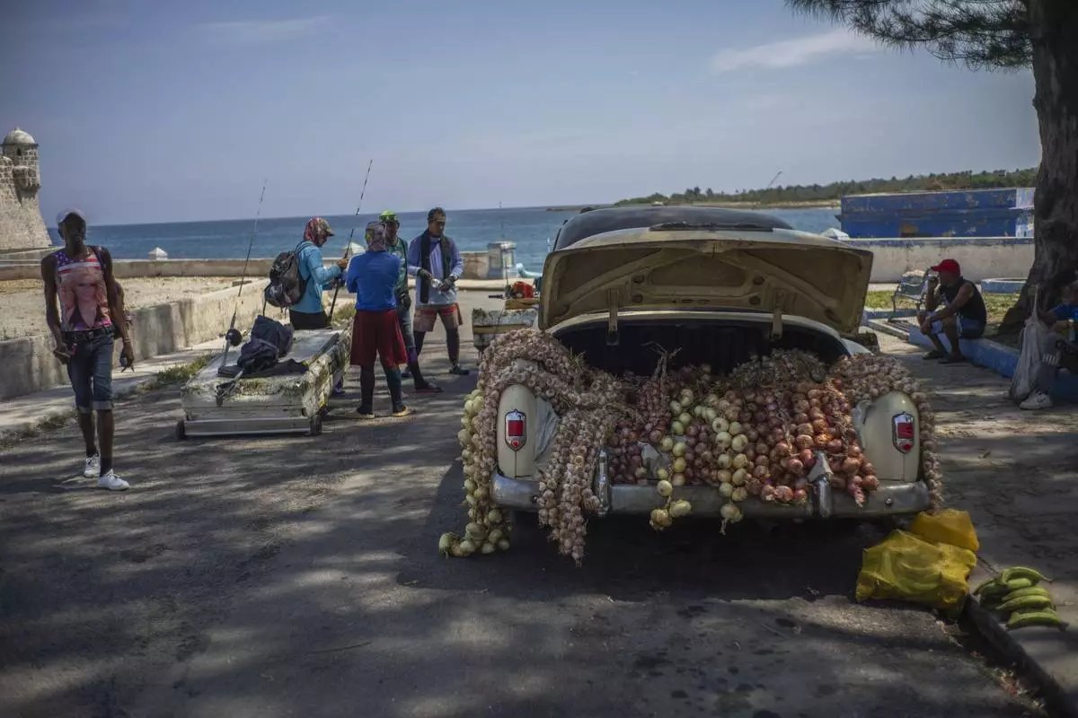 Fishermen talk after a day of fishing on makeshift "corcho" rafts next to a classic American car loaded with garlic and onions for sale in Cojimar, east of Havana, Tuesday, March 25, 2025. (AP Photo/Ramon Espinosa)