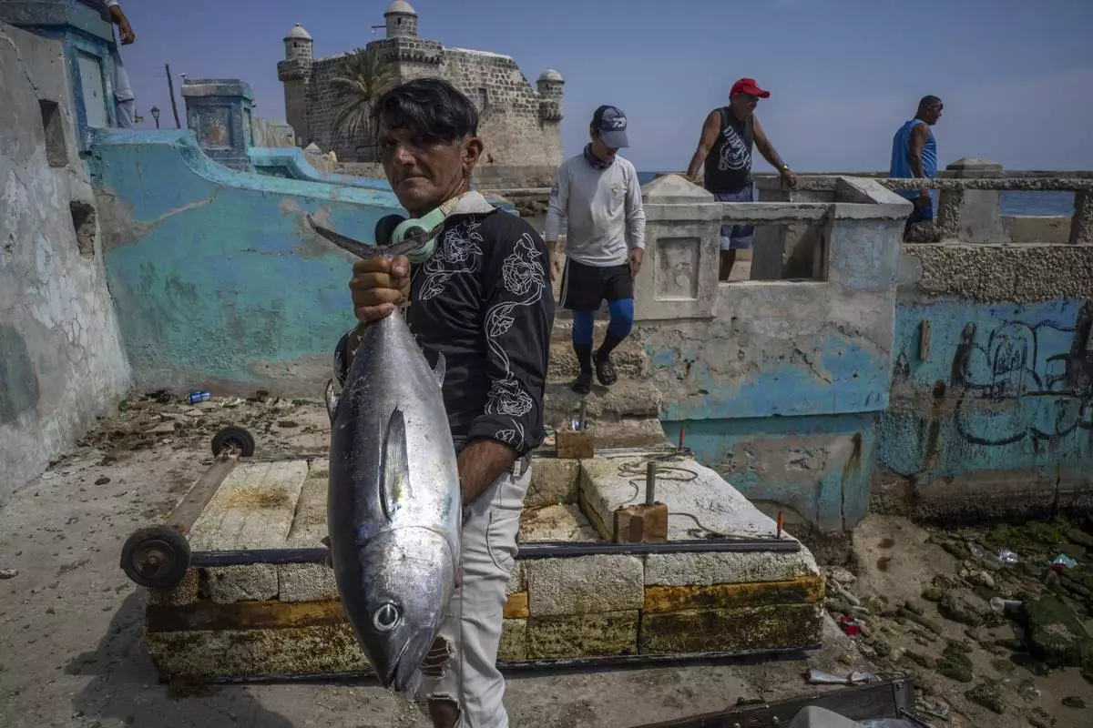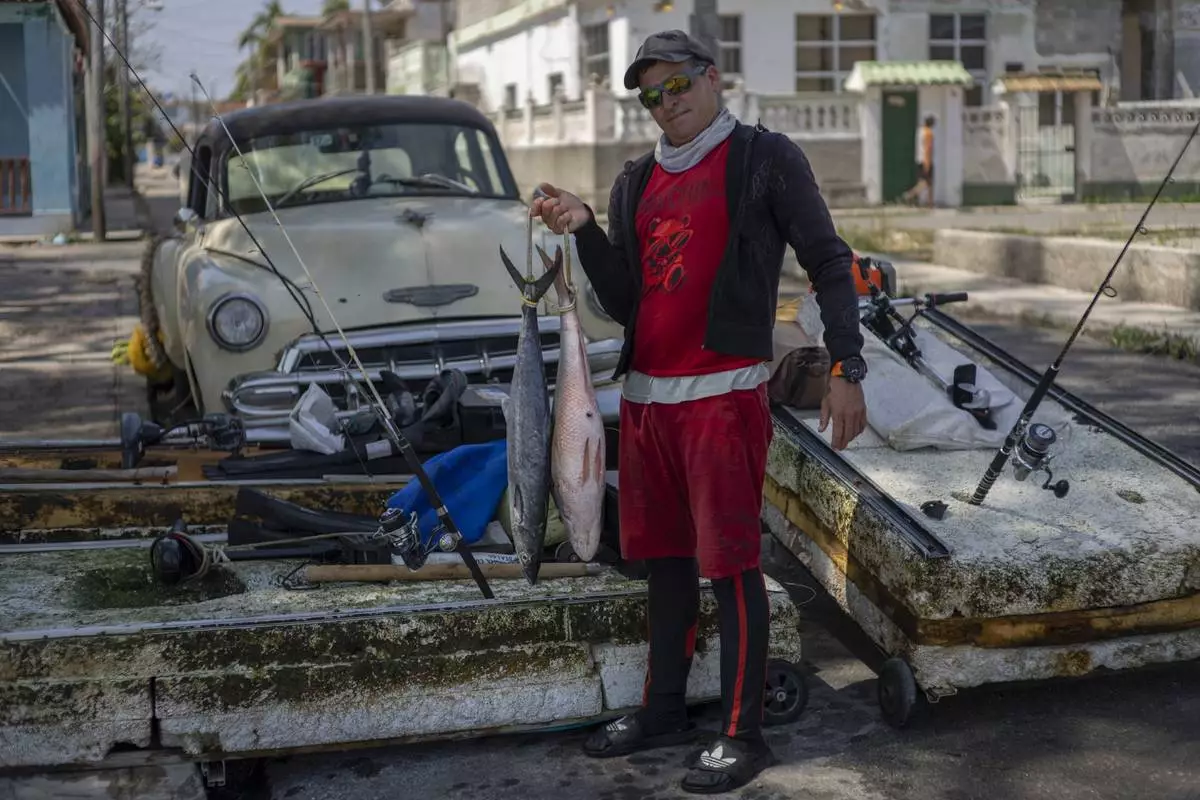 A man shows off the day's catch after fishing on a makeshift raft in Cojimar, east of Havana, Tuesday, March 25, 2025. (AP Photo/Ramon Espinosa)