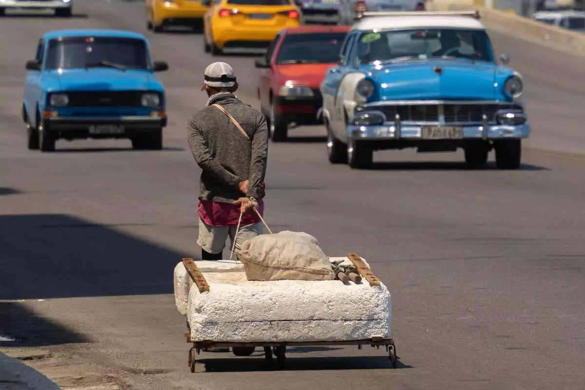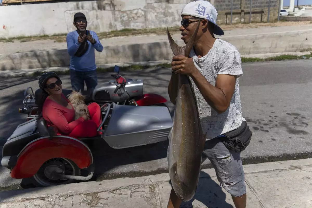A fisherman carries his catch of the day after using a makeshift "corcho" raft in Cojimar, east of Havana, Cuba, Wednesday, March 12, 2025. (AP Photo/Ramon Espinosa)