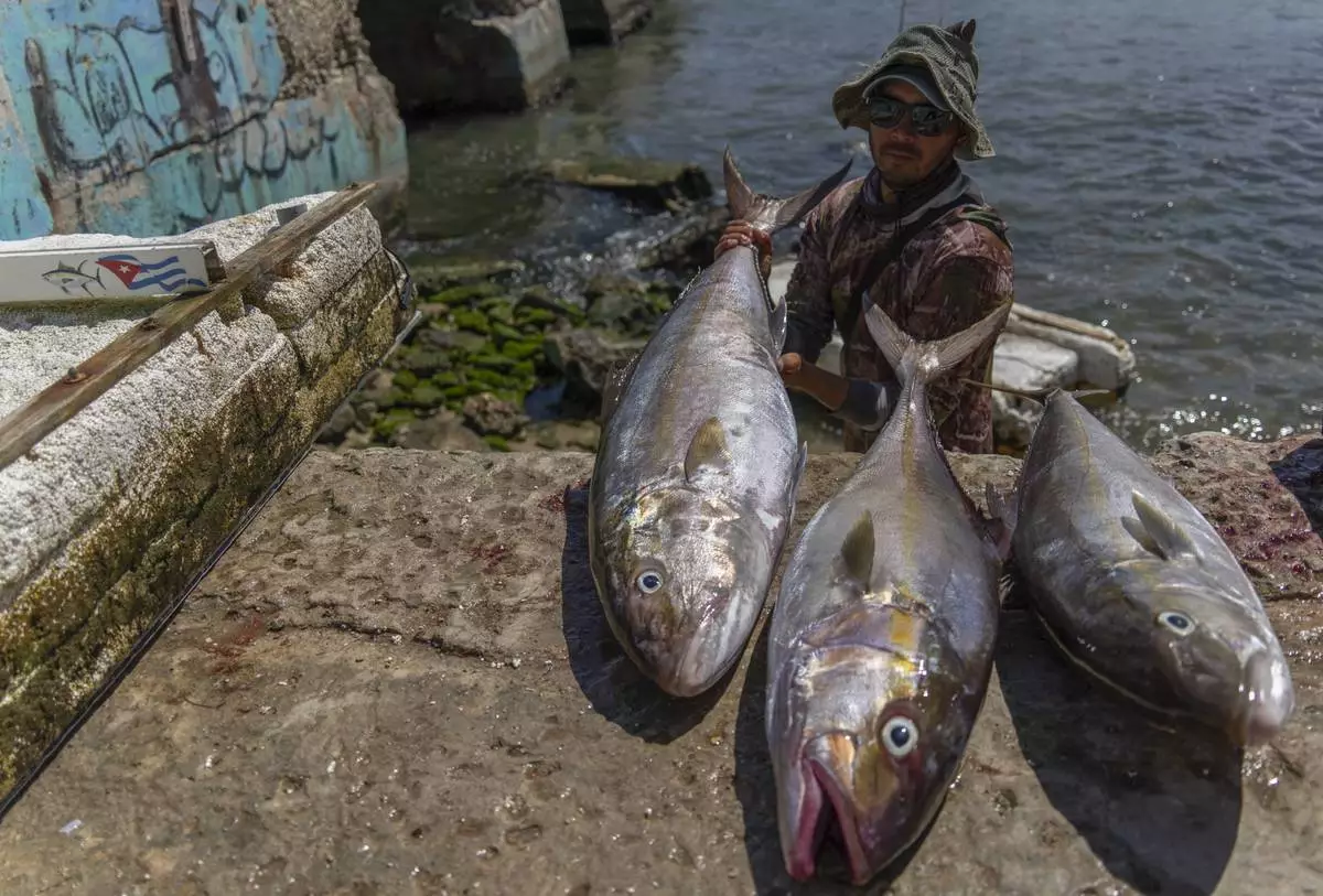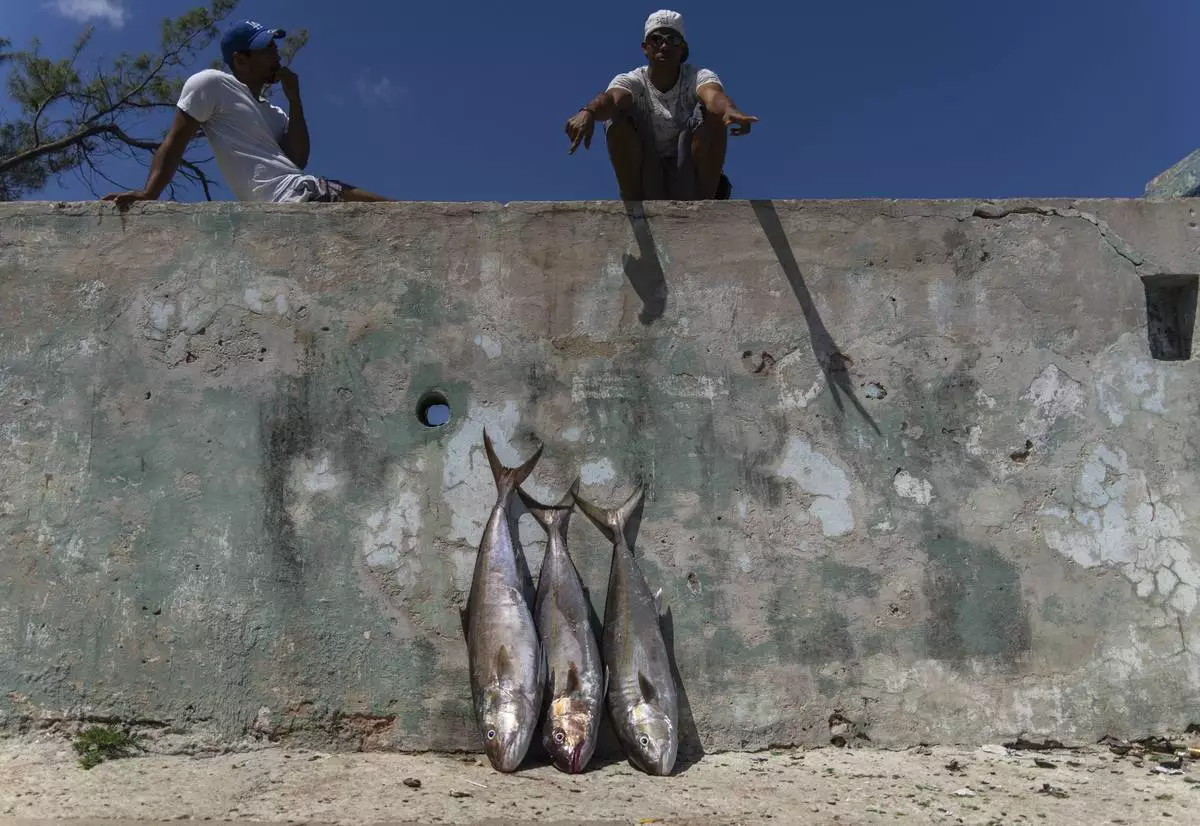 A fisherman places the day's catch on the boardwalk after fishing on a makeshift raft in Cojimar, east of Havana, Wednesday, March 12, 2025. (AP Photo/Ramon Espinosa)