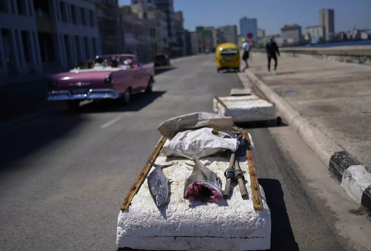 A fisherman's catch of the day lays on a makeshift "corcho" raft before being covered and transported from the Malecon sea wall in Havana, Cuba, Wednesday, March 19, 2025. (AP Photo/Ramon Espinosa)