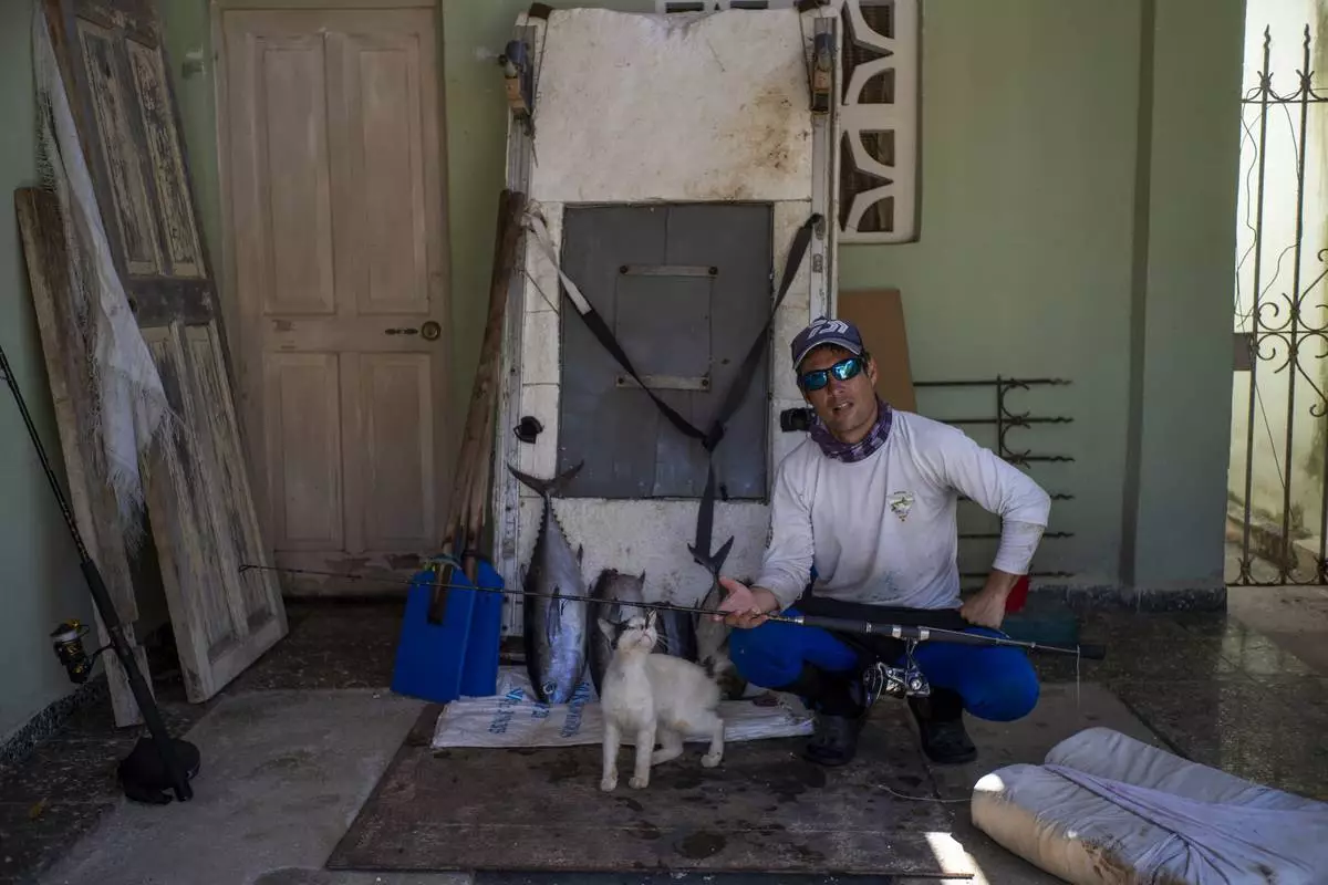Fisherman Miguel Gonzalez poses with the day's catch and his makeshift raft at his home in Cojimar, east of Havana, Tuesday, March 25, 2025. (AP Photo/Ramon Espinosa)
