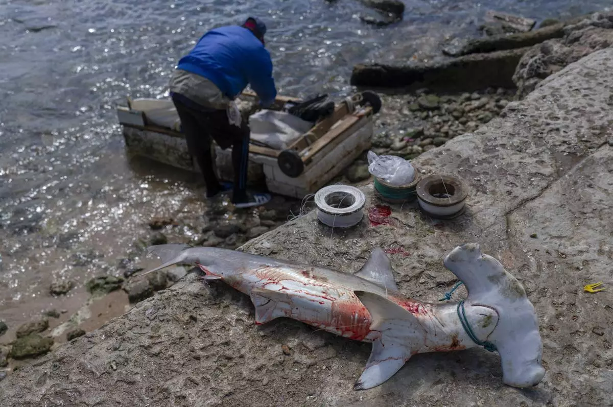 A hammerhead shark lies on the boardwalk as the fisherman who caught it retrieves his makeshift raft in Cojimar, east of Havana, Wednesday, March 12, 2025. (AP Photo/Ramon Espinosa)