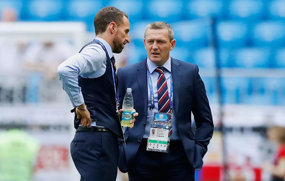FILE - England head coach Gareth Southgate, left, talks with Under 21 manager and delegation member Adrian Boothroyd on the pitch before the quarterfinal match between Sweden and England at the 2018 soccer World Cup in the Samara Arena, in Samara, Russia, Saturday, July 7, 2018. (AP Photo/Alastair Grant, File)