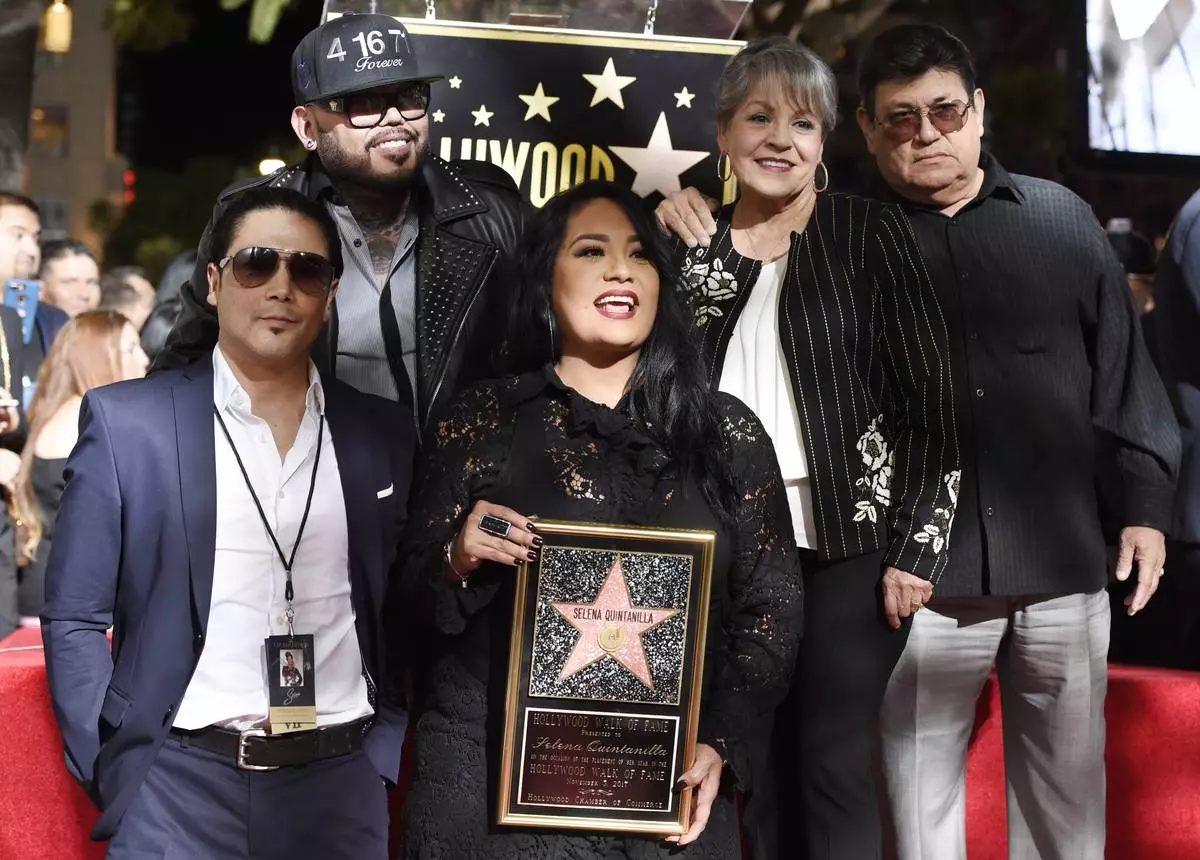 FILE - Suzette Quintanilla, center, sister of the late singer Selena Quintanilla, holds a replica of Selena's star on the Hollywood Walk of Fame as she poses with, from left, Selena's husband Chris Perez, her brother A.B. Quintanilla III, and her parents Marcella Ofelia Samora and Abraham Quintanilla Jr. during a posthumous ceremony on the Hollywood Walk of Fame in Los Angeles on Nov. 3, 2017. (Photo by Chris Pizzello/Invision/AP, File)