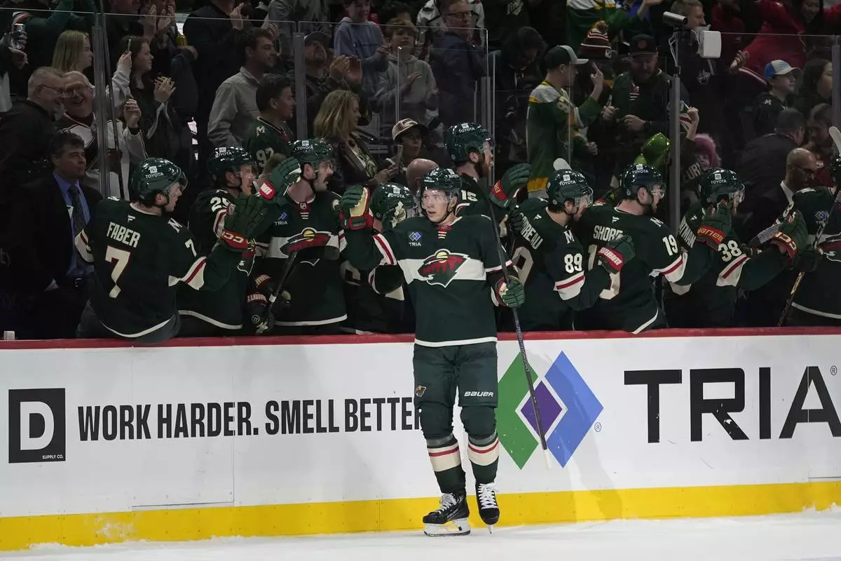 Minnesota Wild left wing Matt Boldy (12) celebrates with teammates after scoring a goal during the second period of an NHL hockey game against the Washington Capitals, Thursday, March 27, 2025, in St. Paul, Minn. (AP Photo/Abbie Parr)