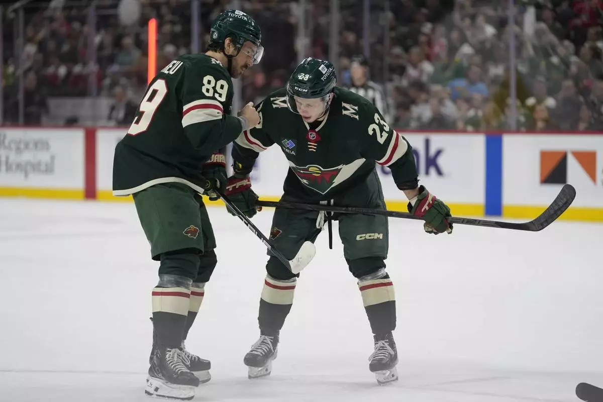 Minnesota Wild center Frederick Gaudreau (89) and center Marco Rossi (23) talk during the first period of an NHL hockey game against the Washington Capitals, Thursday, March 27, 2025, in St. Paul, Minn. (AP Photo/Abbie Parr)