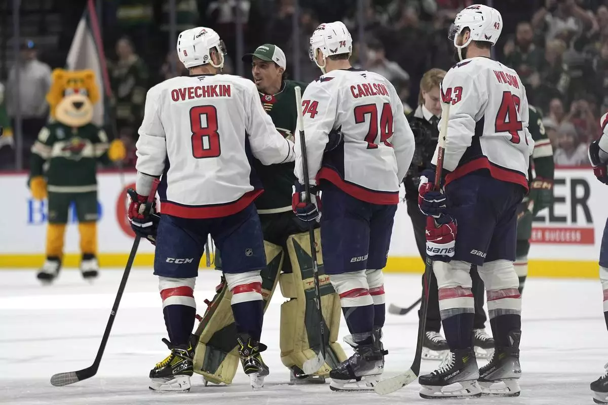The three-time NHL MVP, who has been in the spotlight for months amid his pursuit of Gretzky's career goal mark, hustled over toward the tunnel behind the bench after the horn sounded on Washington's 4-2 loss to make sure all of the Capitals came back on the ice to shake hands with retiring Wild goalie Marc-Andre Fleury. Ovechkin was the first to greet Fleury at mid-ice as they shared a hug and a laugh.