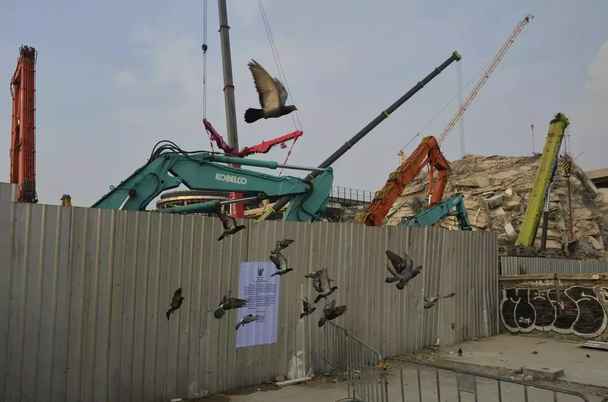 Birds fly past the site of an under construction high-rise building that collapsed after an earthquake in Bangkok, Thailand, Wednesday, April 2, 2025. (AP Photo/Manish Swarup)
