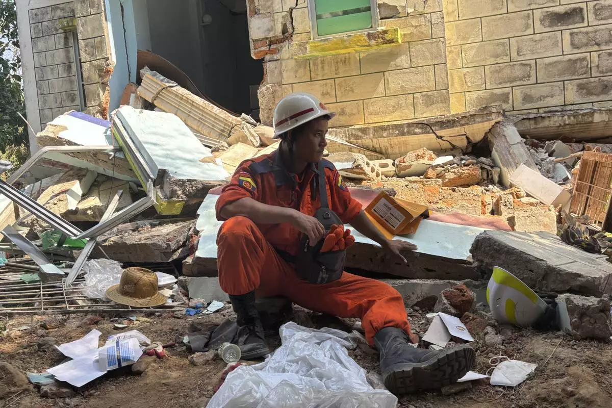 A rescuer rests near a damaged building following Friday's earthquake in Naypyitaw, Myanmar, Thursday, April 3, 2025. (AP Photo)