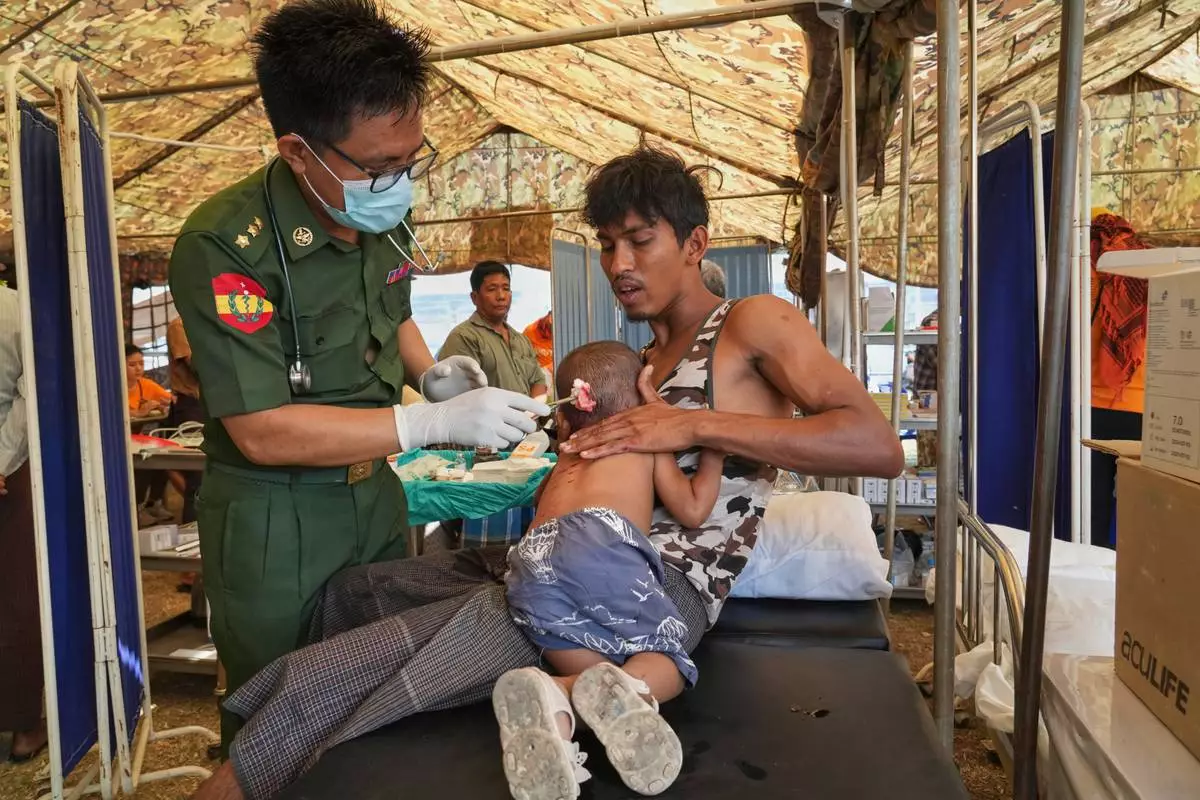 A military medical volunteer gives treatment to a patient at their make-shift tent after last week's earthquake in Naypyitaw, Myanmar, Friday, April 4, 2025. (AP Photo)