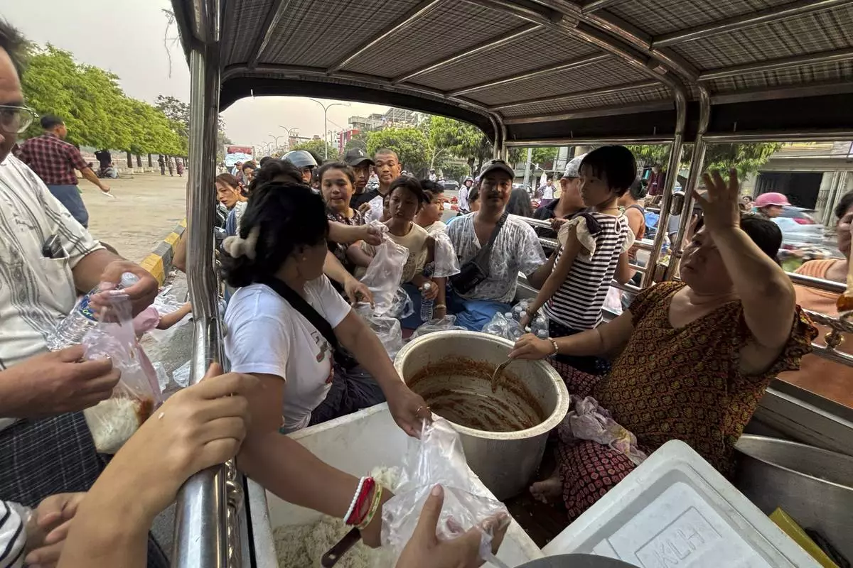 Local volunteers donate food people whose houses were damaged by Friday's earthquake in Naypyitaw, Myanmar, Wednesday, April 2, 2025. (AP Photo)
