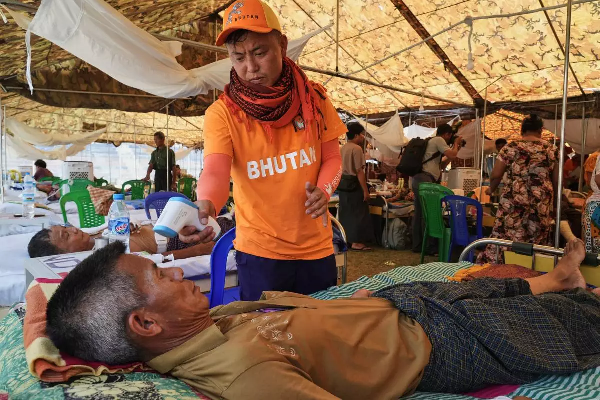 A Bhutanese medical volunteer attends to a patient at a make-shift tent after last week's earthquake in Naypyitaw, Myanmar, Friday, April 4, 2025. (AP Photo)